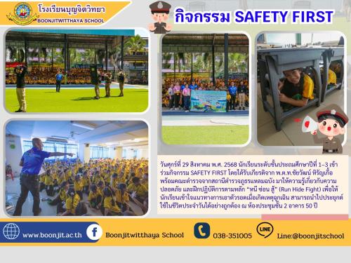วันศุกร์ที่ 29 สิงหาคม พ.ศ. 2568 นักเรียนระดับชั้นประถมศึกษาปีที่ 1–3 เข้าร่วมกิจกรรม SAFETY FIRST โดยได้รับเกียรติจาก พ.ต.ท.ชัยวัฒน์ หิรัญเกื้อ พร้อมคณะตำรวจจากสถานีตำรวจภูธรแหลมฉบัง