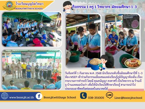 วันจันทร์ที่ 1 กันยายน พ.ศ. 2568 นักเรียนระดับชั้นมัธยมศึกษาปีที่ 1–3 ห้อง MSEP เข้าร่วมกิจกรรมเยี่ยมชมแหล่งเรียนรู้ภูมิปัญญาท้องถิ่น สามารถนำไปประกอบอาชีพหรือต่อยอดในอนาคตได้