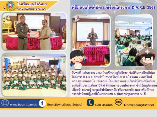 วันพุธที่ 3 กันยายน 2568 โรงเรียนบุญจิตวิทยา จัดพิธีมอบเกียรติบัตรโครงการ D.A.R.E. ประจำปี 2568 โดยมี พ.ต.อ.ไตรเทพ แพทย์รัตน์ ผกก.สภ.แหลมฉบัง และคณะ