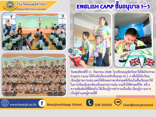 วันพฤหัสบดีที่ 11 กันยายน 2568 โรงเรียนบุญจิตวิทยาได้จัดกิจกรรม English Camp ให้กับนักเรียนระดับชั้นอนุบาล 1-3