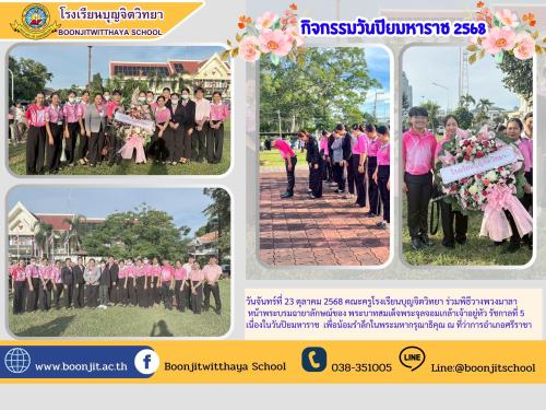วันจันทร์ที่ 23 ตุลาคม 2568 คณะครูโรงเรียนบุญจิตวิทยา ร่วมพิธีวางพวงมาลาหน้าพระบรมฉายาลักษณ์ของ พระบาทสมเด็จพระจุลจอมเกล้าเจ้าอยู่หัว รัชกาลที่ 5