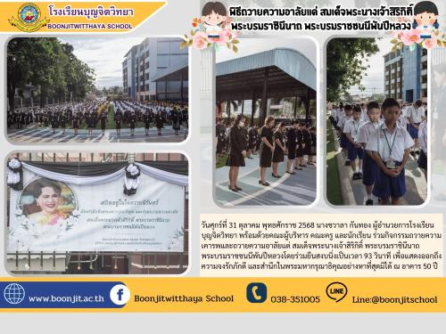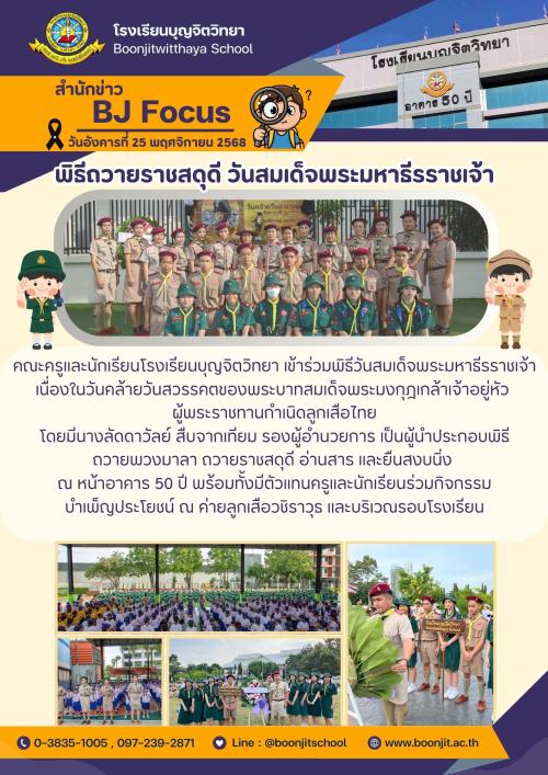 วันศุกร์ที่ 31 ตุลาคม พุทธศักราช 2568 นางชวาลา กันทอง ผู้อำนวยการโรงเรียนบุญจิตวิทยา พร้อมด้วยคณะผู้บริหาร คณะครู และนักเรียน ร่วมกิจกรรมถวายความเคารพ