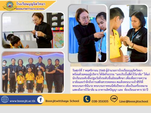 วันศุกร์ที่ 7 พฤศจิกายน 2568 ผู้อำนวยการโรงเรียนบุญจิตวิทยา พร้อมด้วยคณะผู้บริหาร ได้จัดกิจกรรม “มอบริบบิ้นสีดำไว้อาลัย” ให้แก่นักเรียนระดับชั้นปฐมวัยถึงระดับชั้น