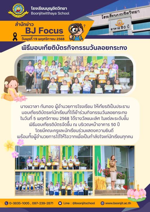 นางชวาลา กันทอง ผู้อำนวยการโรงเรียน ให้เกียรติเป็นประธานมอบเกียรติบัตรแก่นักเรียนที่ได้เข้าร่วมกิจกรรมวันลอยกระทง ในวันที่ 5 พฤศจิกายน 2568 ได้รางวัลชนะเลิศ