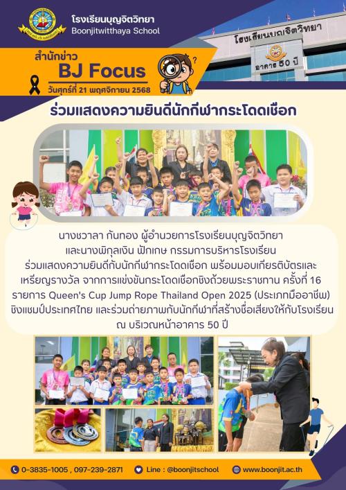 วันศุกร์ที่ 21 พฤศจิกายน 2568 นางชวาลา กันทอง ผู้อำนวยการโรงเรียนบุญจิตวิทยา และนางพิกุลเงิน ฟักเกษ กรรมการบริหารโรงเรียน ร่วมแสดงความยินดีกับนักกีฬากระโดดเชือก