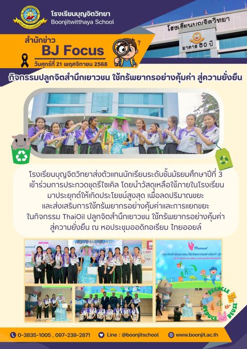 โรงเรียนบุญจิตวิทยาส่งตัวแทนนักเรียนระดับชั้นมัธยมศึกษาปีที่ 3 เข้าร่วมการประกวดชุดรีไซเคิล โดยนำวัสดุเหลือใช้ภายในโรงเรียนมาประยุกต์ให้เกิดประโยชน์สูงสุด