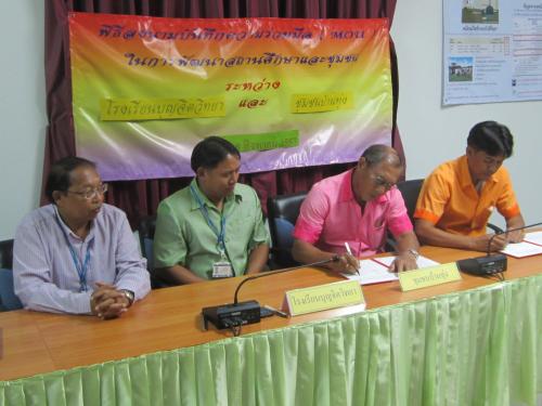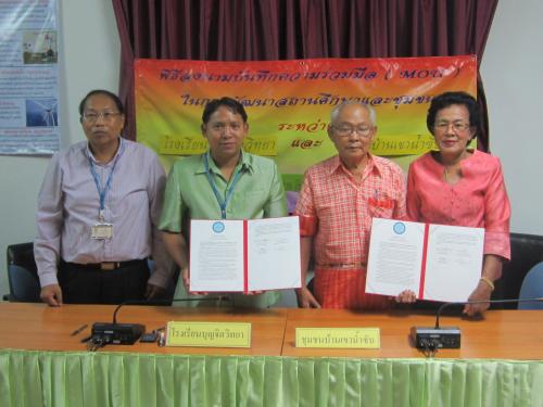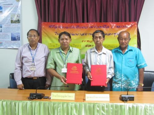 28 ส.ค. 57 โรงเรียนบุญจิตวิทยา โดย ดร.จักรกฤช กันทอง ผู้อำนวยการ อ.สนธยา ตุ๋นเจริญ ที่ปรึกษา และ ชุมชนบ้านแหลมฉบัง โดย นายอัมพร คชรัตน์ ประธานชุมชน นายมานะ ภู่ละมัย ลงนามบันทึกความร่วมมือ (MOU) ในการพัฒนาสถานศึกษาและชุมชน
