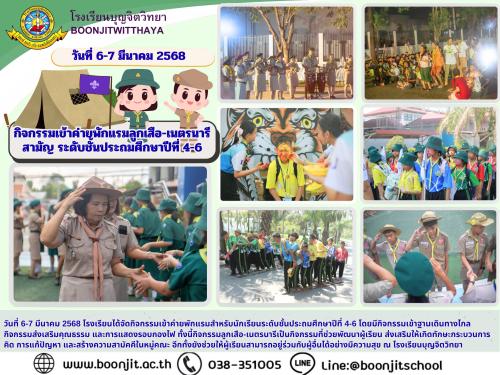วันที่ 6-7 มีนาคม 2568 โรงเรียนได้จัดกิจกรรมเข้าค่ายพักแรมสำหรับนักเรียนระดับชั้นประถมศึกษาปีที่ 4-6 โดยมีกิจกรรมเข้าฐานเดินทางไกล