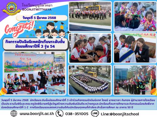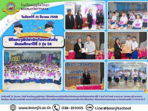 วันจันทร์ที่ 31 มีนาคม 2568 โรงเรียนบุญจิตวิทยา ได้จัดพิธีมอบวุฒิบัตรให้แก่นักเรียนระดับชั้นมัธยมศึกษาปีที่ 3 รุ่นที่ 54 โดยมี นางชวาลา กันทอง ผู้อำนวยการโรงเรียน