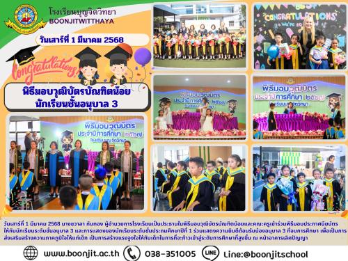 วันเสาร์ที่ 1 มีนาคม 2568 นางชวาลา กันทอง ผู้อำนวยการโรงเรียนเป็นประธานในพิธีมอบวุฒิบัตรบัณฑิตน้อยและคณะครูเข้าร่วมพิธีมอบประกาศนียบัตร