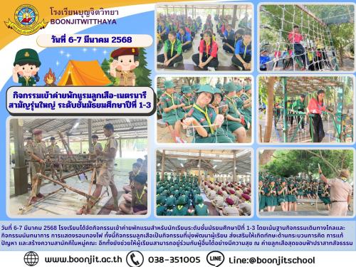 วันที่ 6-7 มีนาคม 2568 โรงเรียนได้จัดกิจกรรมเข้าค่ายพักแรมสำหรับนักเรียนระดับชั้นมัธยมศึกษาปีที่ 1-3 โดยเน้นฐานกิจกรรมเดินทางไกลและกิจกรรมนันทนาการ
