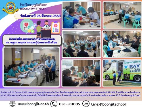 วันอังคารที่ 25 มีนาคม 2568 บุคลากรครูและผู้ปกครองนักเรียน โรงเรียนบุญจิตวิทยา เข้าร่วมการตรวจสุขภาพประจำปี 2568 โดยได้รับความร่วมมือ