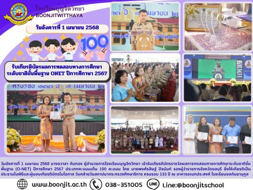 วันอังคารที่ 1 เมษายน 2568 นางชวาลา กันทอง ผู้อำนวยการโรงเรียนบุญจิตวิทยา เข้ารับเกียรติบัตรรางวัลผลการทดสอบทางการศึกษาระดับชาติขั้นพื้นฐาน (O-NET) ปีการศึกษา 2567