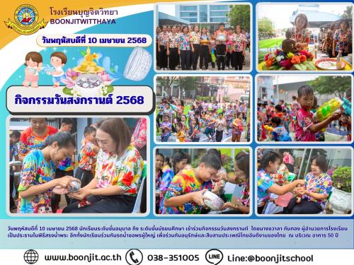วันพฤหัสบดีที่ 10 เมษายน 2568 นักเรียนระดับชั้นอนุบาล ถึง ระดับชั้นมัธยมศึกษา เข้าร่วมกิจกรรมวันสงกรานต์ โดยนางชวาลา กันทอง ผู้อำนวยการโรงเรียน