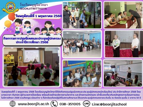 วันพฤหัสบดีที่ 1 พฤษภาคม 2568 โรงเรียนบุญจิตวิทยาได้จัดกิจกรรมปฐมนิเทศและประชุมผู้ปกครองนักเรียนใหม่ ประจำปีการศึกษา 2568