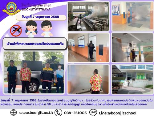 วันพุธที่ 7 พฤษภาคม 2568 ในช่วงปิดเทอมโรงเรียนบุญจิตวิทยา โดยร่วมกับเทศบาลนครแหลมฉบังฉีดพ่นหมอกควันในห้องเรียน