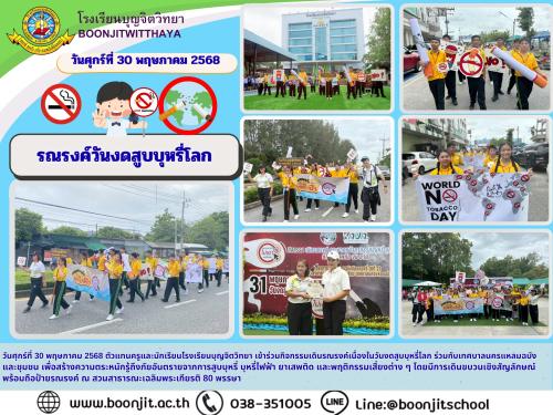 วันศุกร์ที่ 30 พฤษภาคม 2568 ตัวแทนครูและนักเรียนโรงเรียนบุญจิตวิทยา เข้าร่วมกิจกรรมเดินรณรงค์เนื่องในวันงดสูบบุหรี่โลก ร่วมกับเทศบาลนครแหลมฉบังและชุมชน