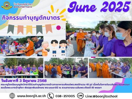 วันอังคารที่ 3 มิถุนายน 2568 คณะครูโรงเรียนบุญจิตวิทยาได้ร่วมทำบุญตักบาตรข้าวสารอาหารแห้งแด่พระสงฆ์จำนวน 48 รูป เนื่องในโอกาสวันเฉลิมพระชนมพรรษา