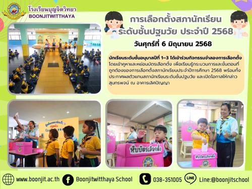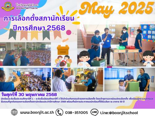 วันศุกร์ที่ 30 พฤษภาคม 2568 นักเรียนระดับชั้นประถมศึกษาปีที่ 1 – ระดับชั้นมัธยมศึกษาปีที่ 3 ได้เข้าร่วมกิจกรรมจำลองการเลือกตั้ง โดยเข้าคูหาและหย่อนบัตรเลือกตั้ง