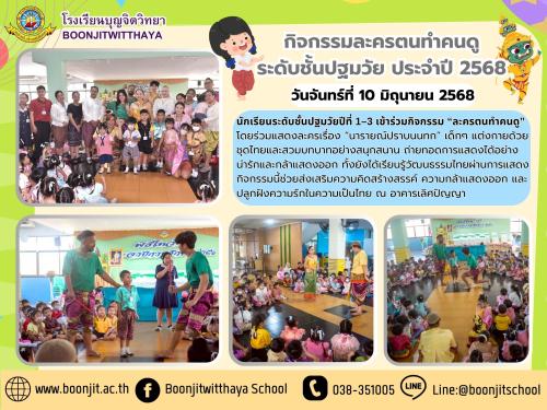 วันจันทร์ที่ 10 มิถุนายน 2568 นักเรียนระดับชั้นปฐมวัยปีที่ 1–3 เข้าร่วมกิจกรรม “ละครตนทำคนดู” โดยร่วมแสดงละครเรื่อง “นารายณ์ปราบนนทก” เด็กๆ แต่งกายด้วยชุดไทยและสวมบทบาทอย่างสนุกสนาน