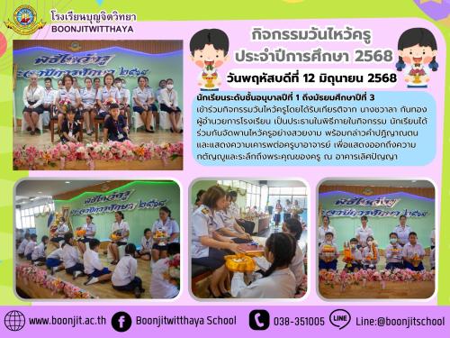 วันพฤหัสบดีที่ 12 มิถุนายน 2568 นักเรียนระดับชั้นอนุบาลปีที่ 1 ถึงมัธยมศึกษาปีที่ 3 เข้าร่วมกิจกรรมวันไหว้ครู โดยได้รับเกียรติจาก นางชวาลา กันทอง ผู้อำนวยการโรงเรียน เป็นประธานในพิธีภายในกิจกรรม