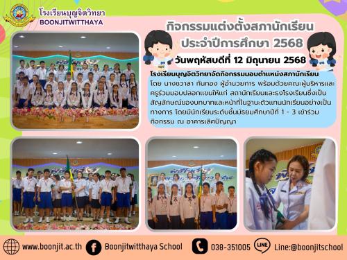 วันพฤหัสบดีที่ 12 มิถุนายน 2568 โรงเรียนบุญจิตวิทยาจัดกิจกรรมมอบตำเเหน่งสภานักเรียน โดย นางชวาลา กันทอง ผู้อำนวยการ พร้อมด้วยคณะผู้บริหารและครูร่วมมอบปลอกเเขนให้เเก่