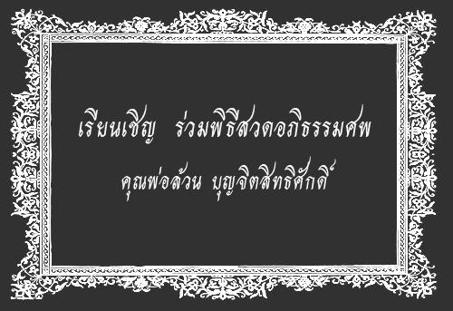 ขอเชิญร่วมพิธีสวดอภิธรรมศพ คุณพ่อล้วน บุญจิตสิทธิศักดิ์ ระหว่างวันที่