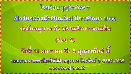 ขณะนี้ โรงเรียนบุญจิตวิทยา กำลังเปิดรับสมัครนักเรียนใหม่ปีการศึกษา 2556