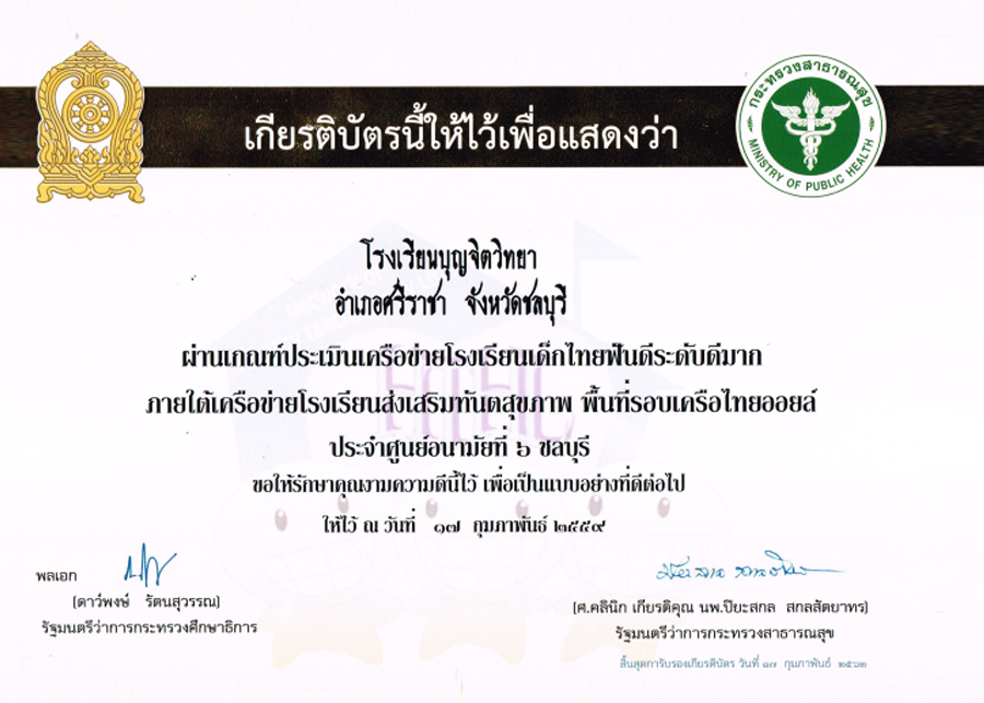 โรงเรียนบุญจิตวิทยาผ่านเกณฑ์การประเมินเครือข่ายโรงเรียนเด็กไทยฟันดี ระดับดีมาก