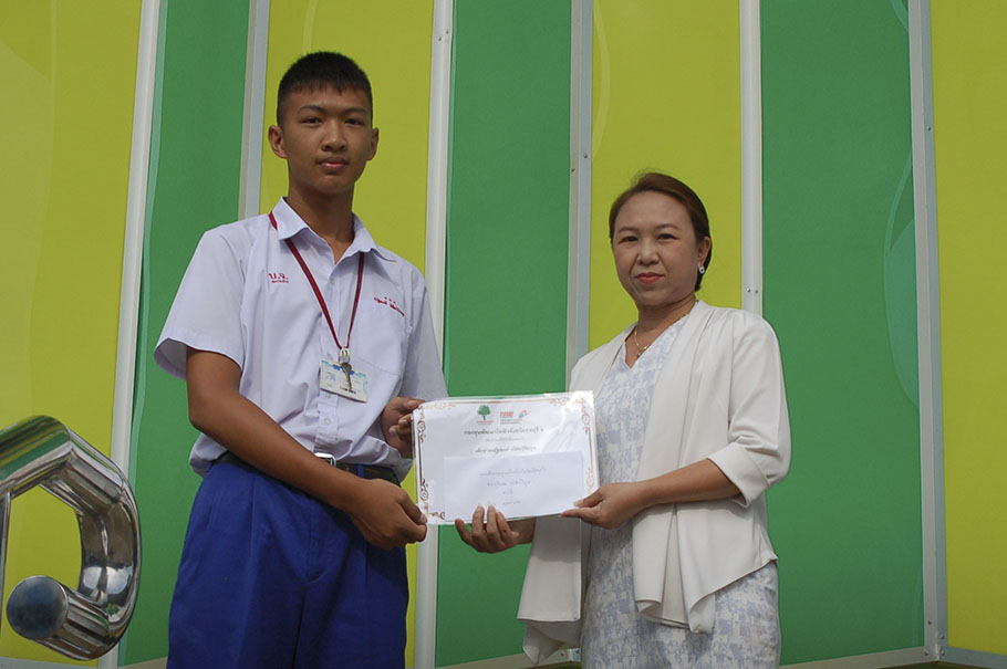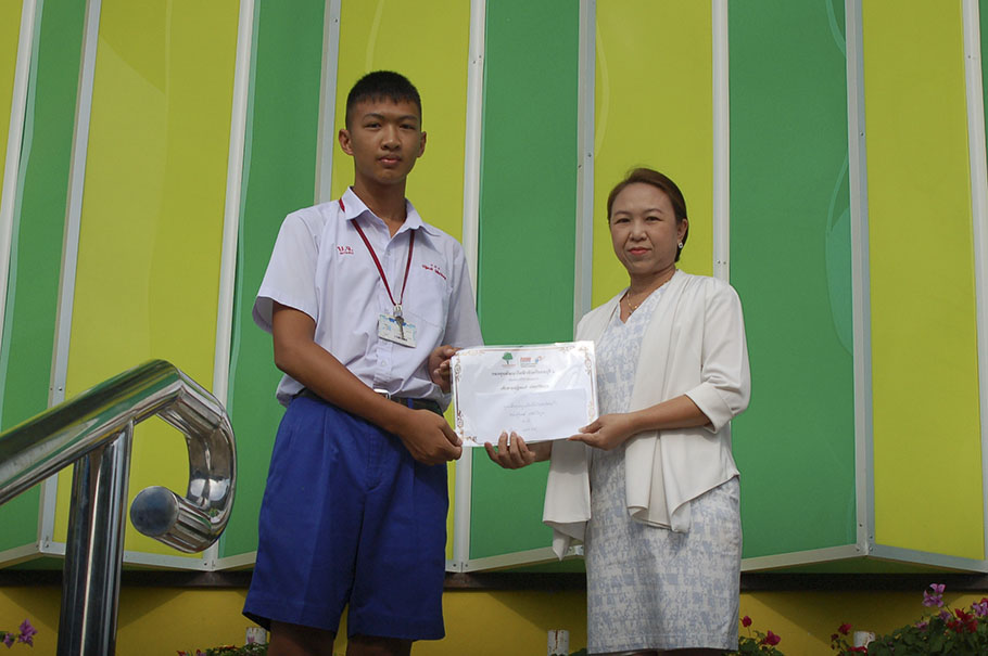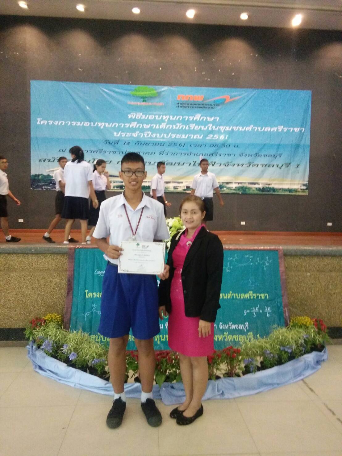 นำนักเรียน ด.ช.ณัฐพงศ์ ทัฬหวิริยกุล นักเรียนชั้นมัธยมศึกษาปีที่ 3 เข้ารับทุนการศึกษาของกองทุนพัฒนาไฟฟ้าจังหวัดชลบุรี 1