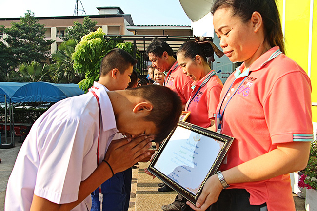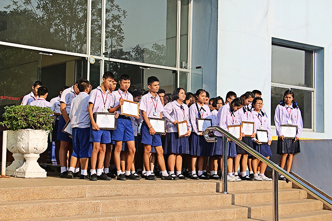 และคณะครู เป็นผู้ให้เกียรติ มอบเกียรติบัตรแก่นักเรียนที่เป็นตัวแทนลูกเสือจราจรโรงเรียนบุญจิตวิทยา