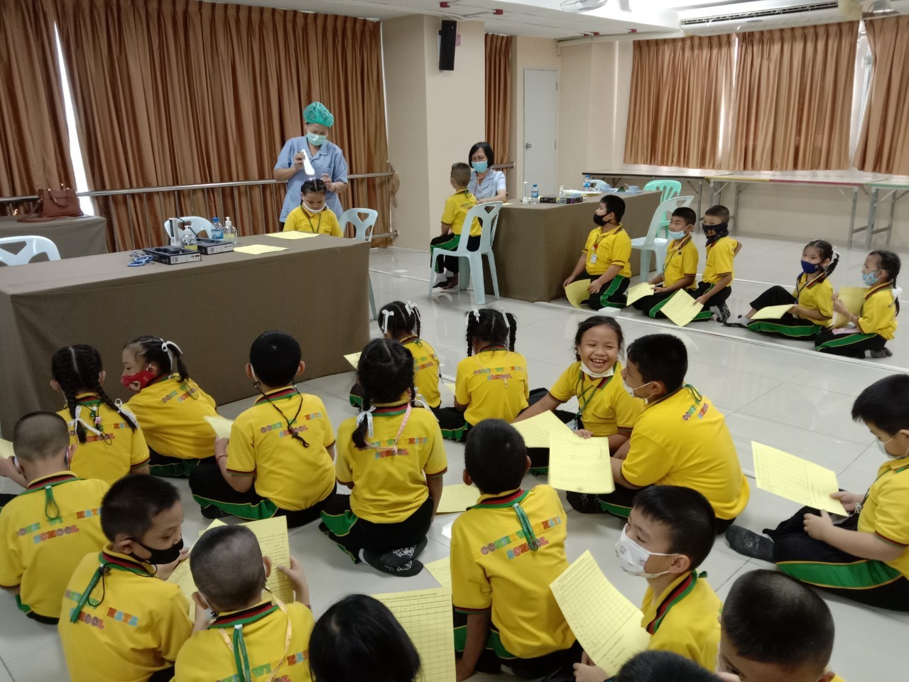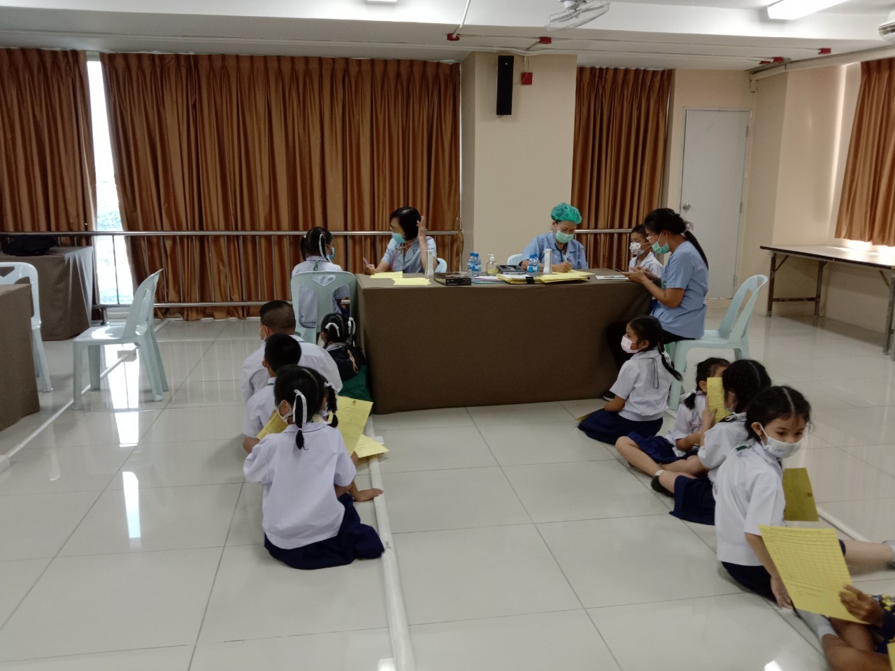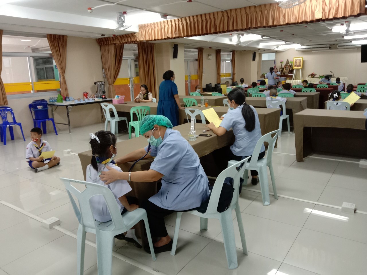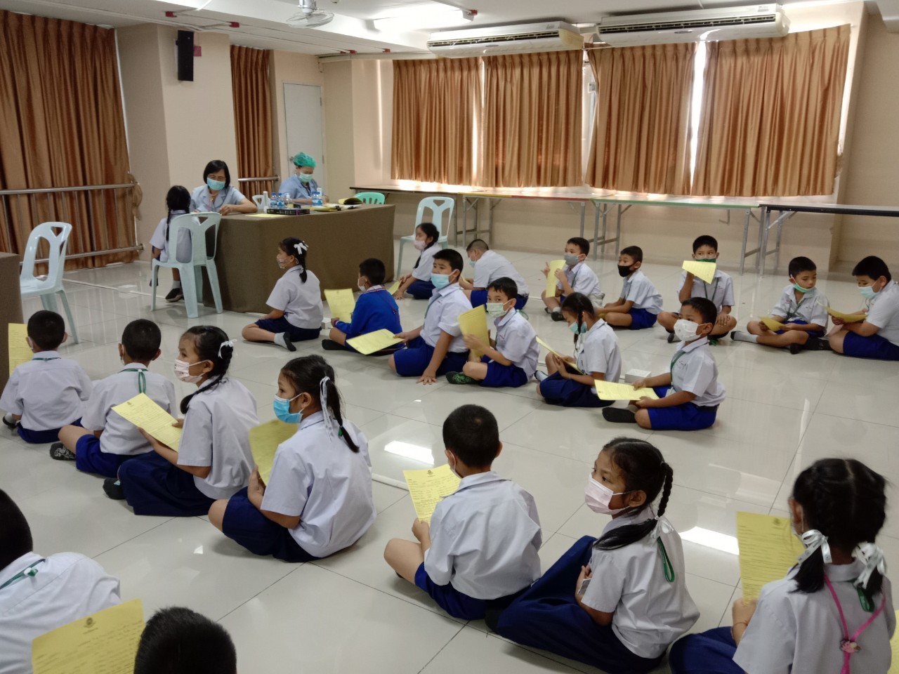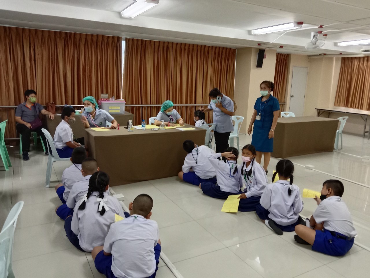 วันที่11 ,16, 17 กันยายน 2563 เจ้าหน้าที่สาธารณสุขโรงพยาบาลแหลมฉบัง ตรวจสุขอนามัย วัดสายตา ชั้นประถมปีที่1-4 และ ฉีดวัคซีนนักเรียนชั้นประถมปีที่ 1 และ 6