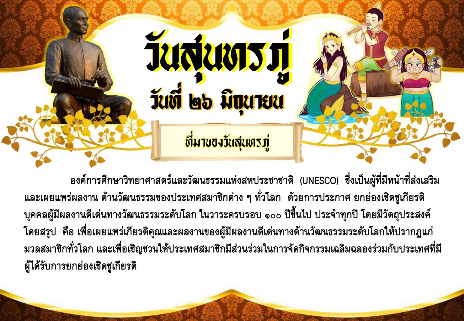วันที่ ๒๖ มิถุนายน เป็นวันคล้ายวันเกิดของพระสุนทรโวหาร (สุนทรภู่) เจ้ากรมพระอาลักษณ์ฝ่ายพระราชวัง ผู้ได้รับการยกย่องว่าเป็นกวีเอกแห่งกรุงรัตนโกสินทร์ตอนต้น และมีผลงานประพันธ์มากมาย เฉพาะเรื่อง พระอภัยมณี วรรณกรรมชิ้นเอกของท่าน ก็มีความยาวถึง ๑๒,๗๐๖ บท ถือได้ว่าเป็นกวีนิพนธ์ที่ยาวที่สุดในโลก ในขณะที่บทประพันธ์เรื่องอีเลียต (Iliad)) และโอเดดซี (Odyssey) ของฝรั่งที่ว่ายาวที่สุด ยังมีเพียง ๑๒,๕๐๐ บทเท่านั้น เมื่อปี พ.ศ. ๒๕๒๙ ท่านได้รับยกย่องจากยูเนสโก ให้เป็นบุคคลผู้มีผลงานดีเด่นทางวัฒนธรรมระดับโลก
