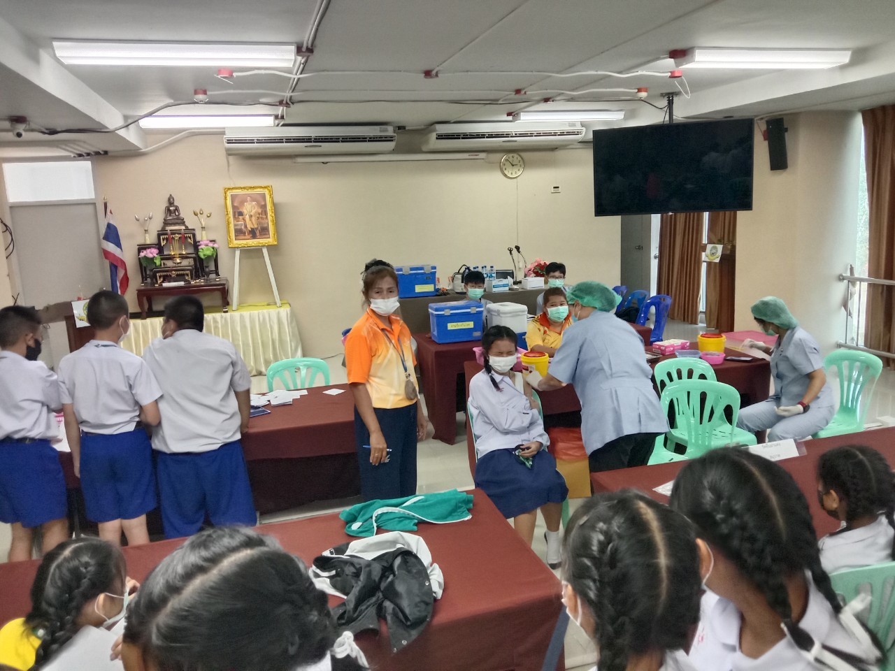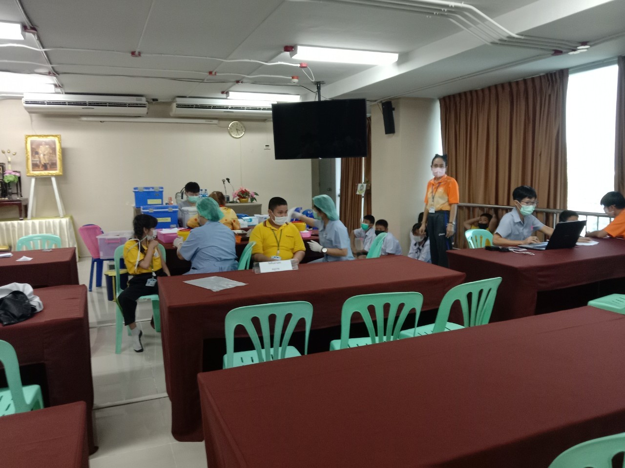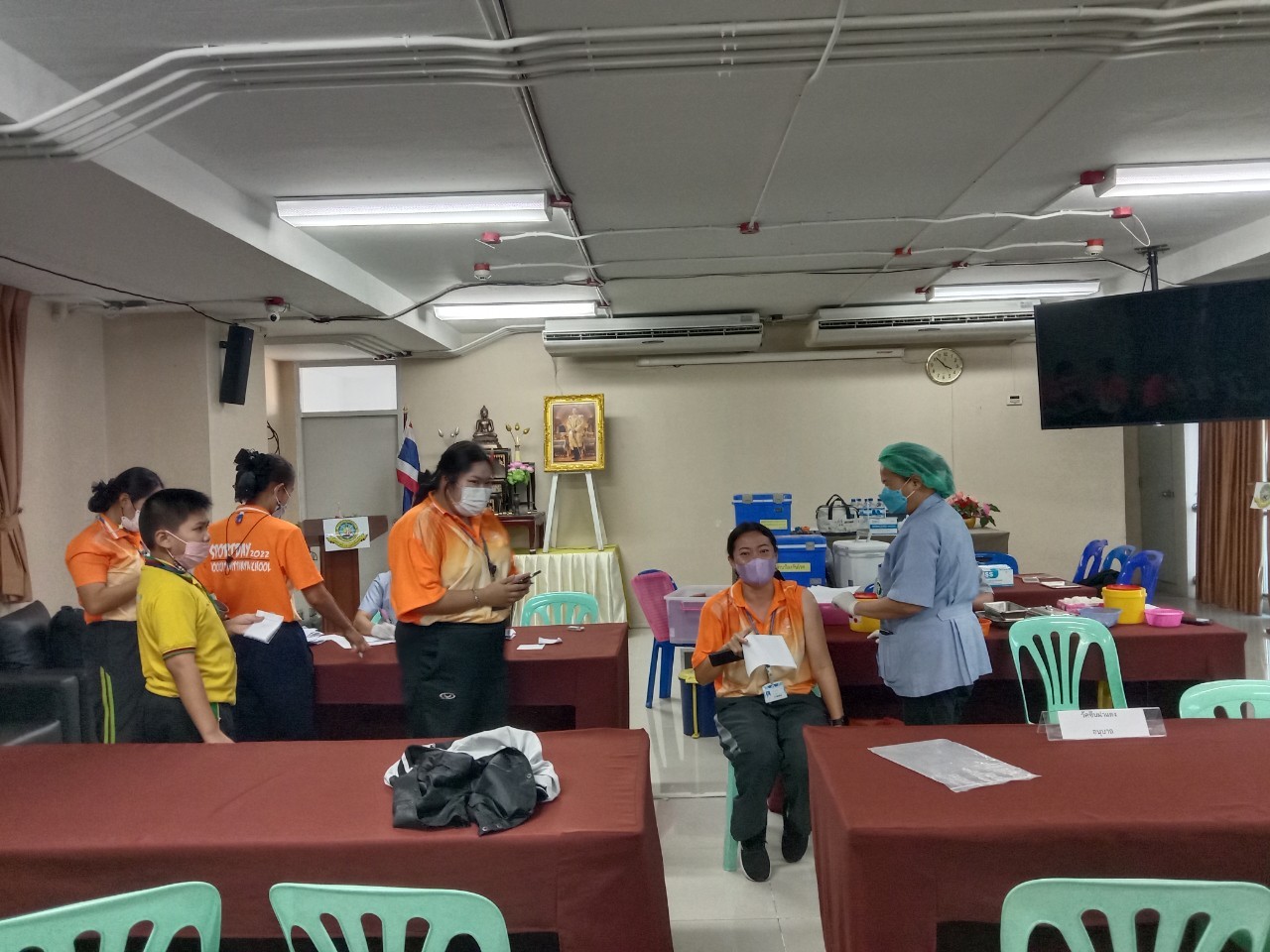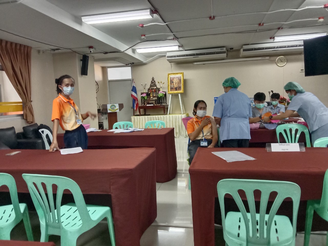 เจ้าหน้าที่จากโรงพยาบาลแหลมฉบัง ฉีดวัคซีน Pfizer ให้กับนักเรียนและครู ณห้องประชุมชั้น 4 อาคาร 50 ปี