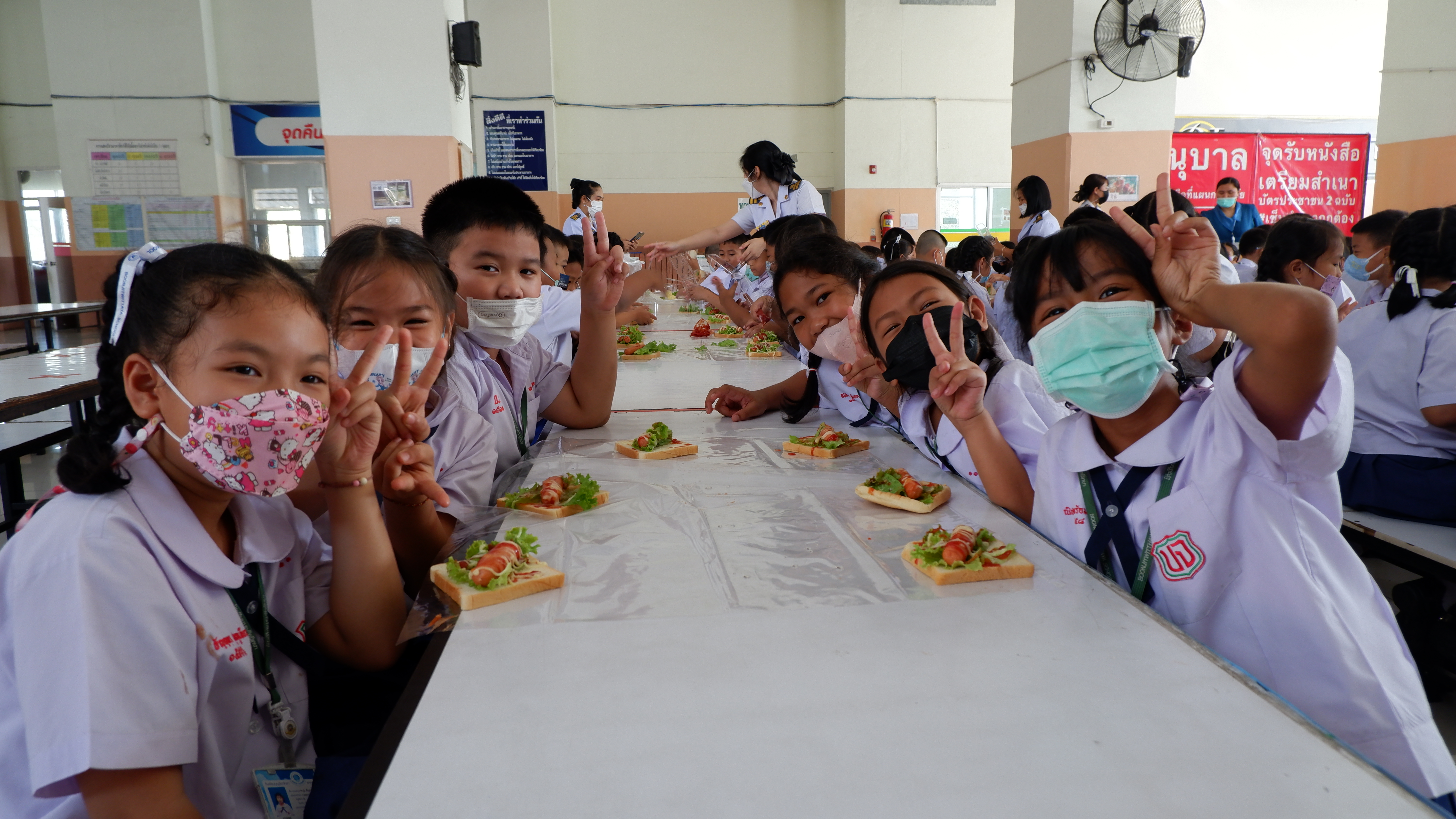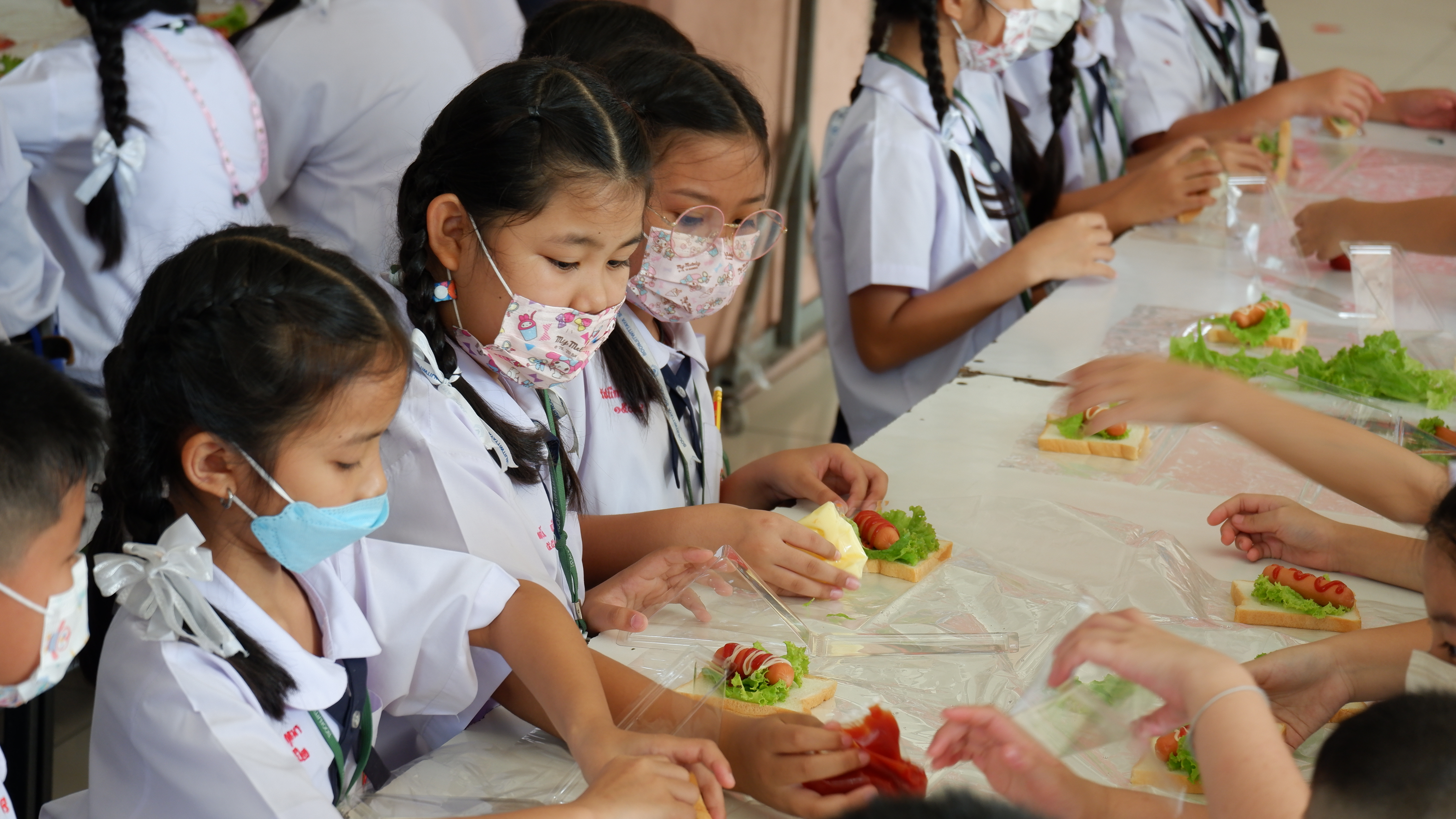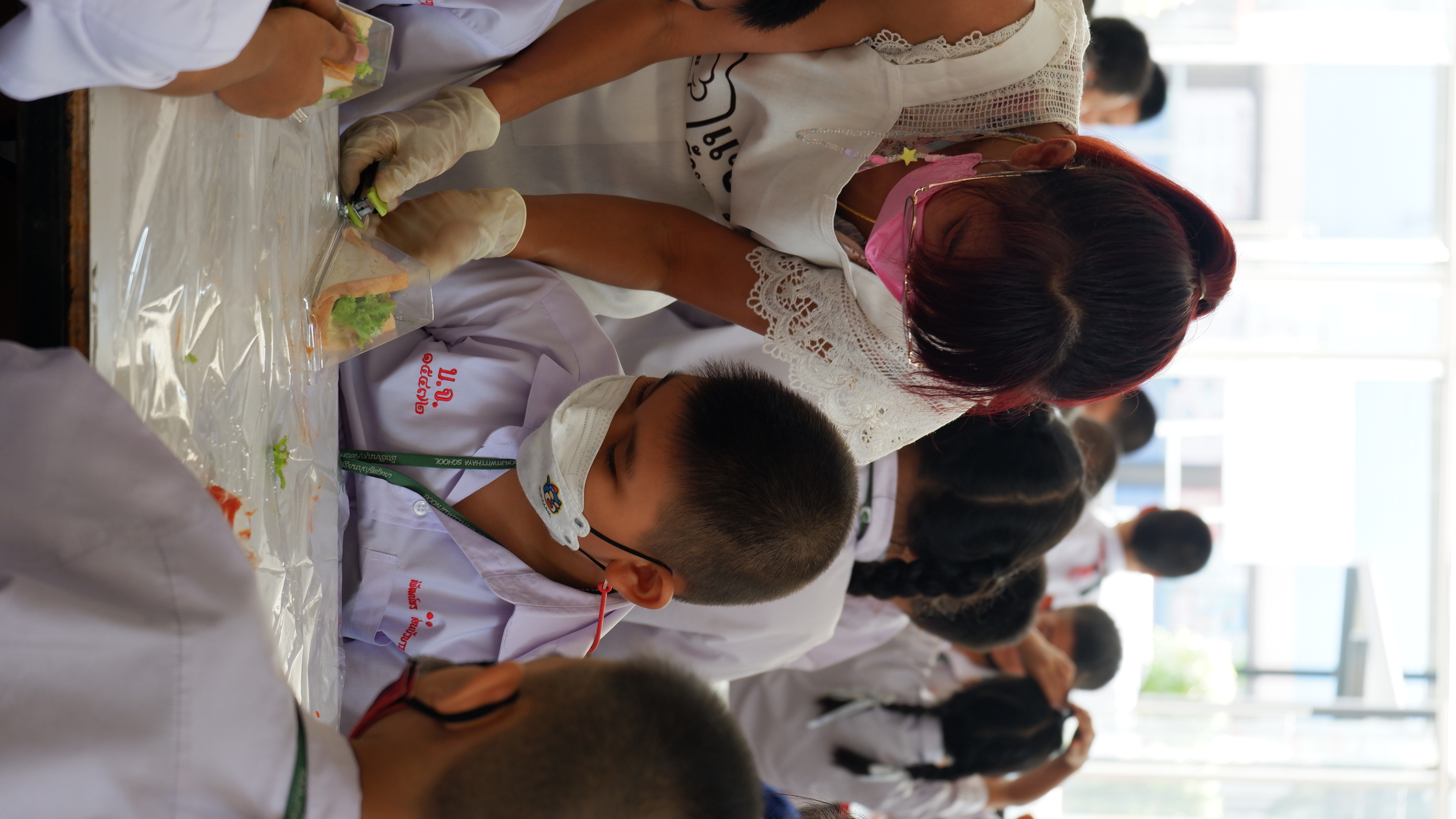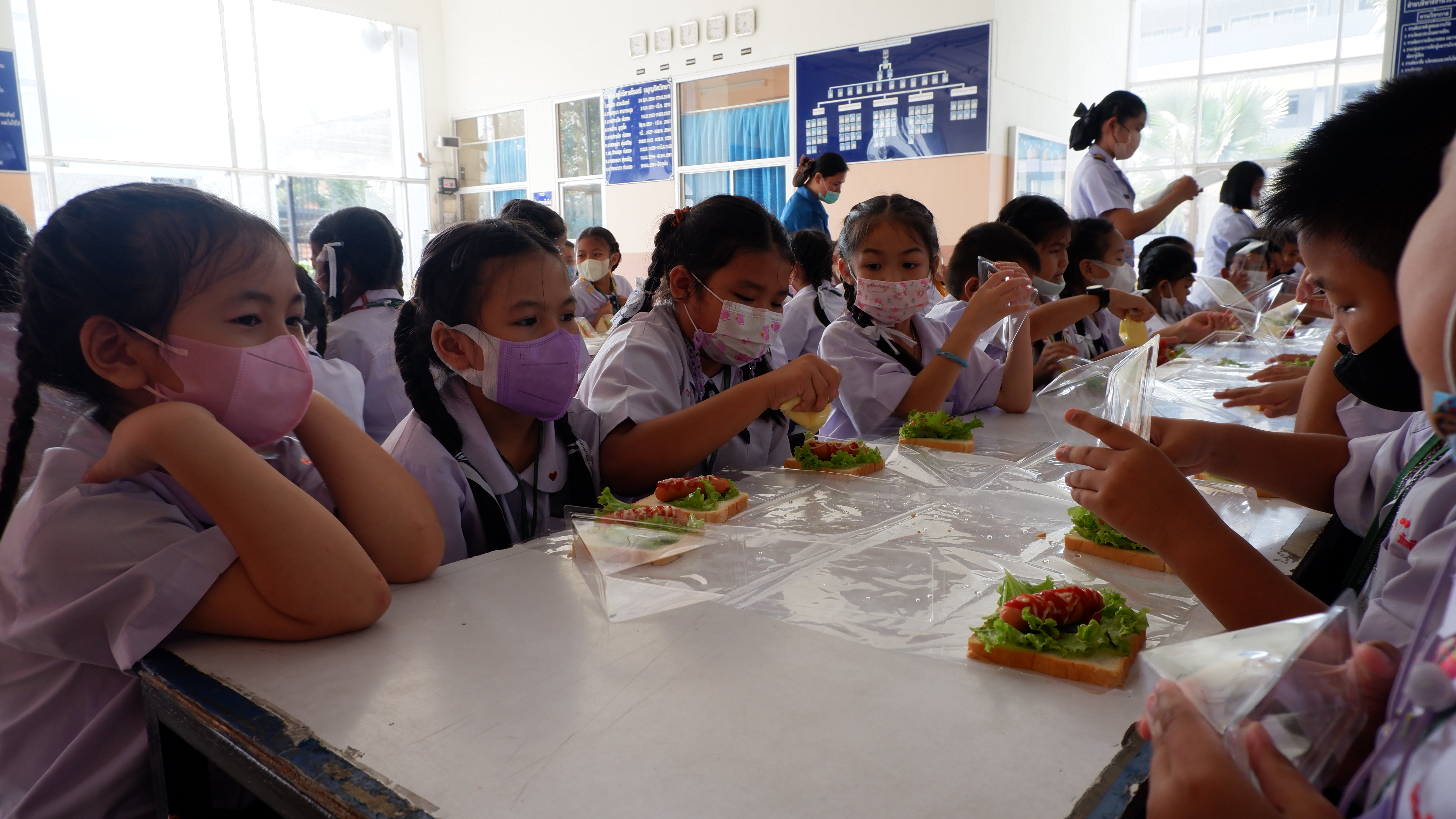 วันจันทร์ที่ 13 กุมภาพันธ์ 2566 กิจกรรมหนึ่งครูหนึ่งวิทยากรการทำแซนวิช นักเรียนชั้นประถมศึกษาที่ 3 การทำแซนวิช ณโรงอาหารอาคาร 50ปี