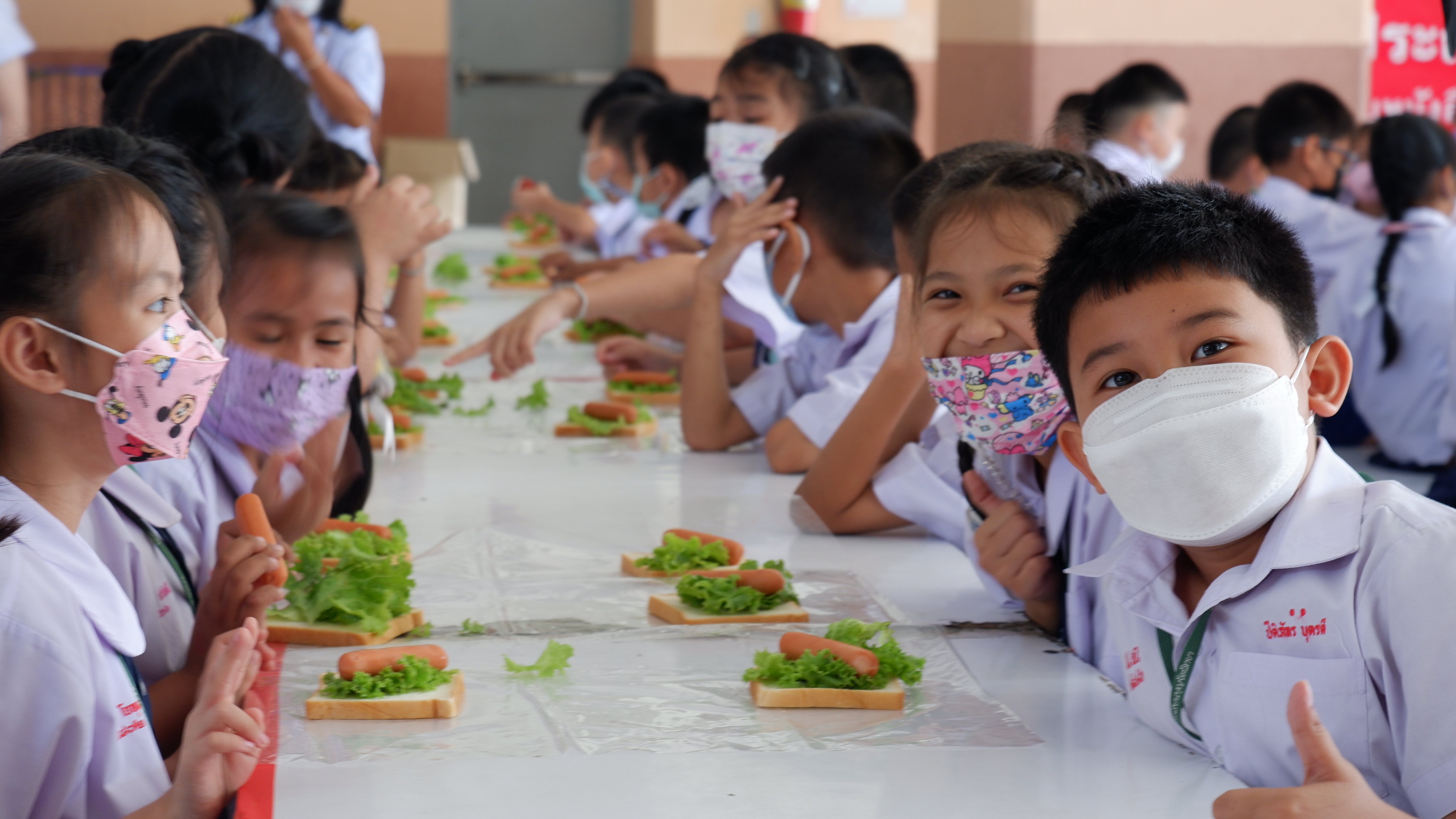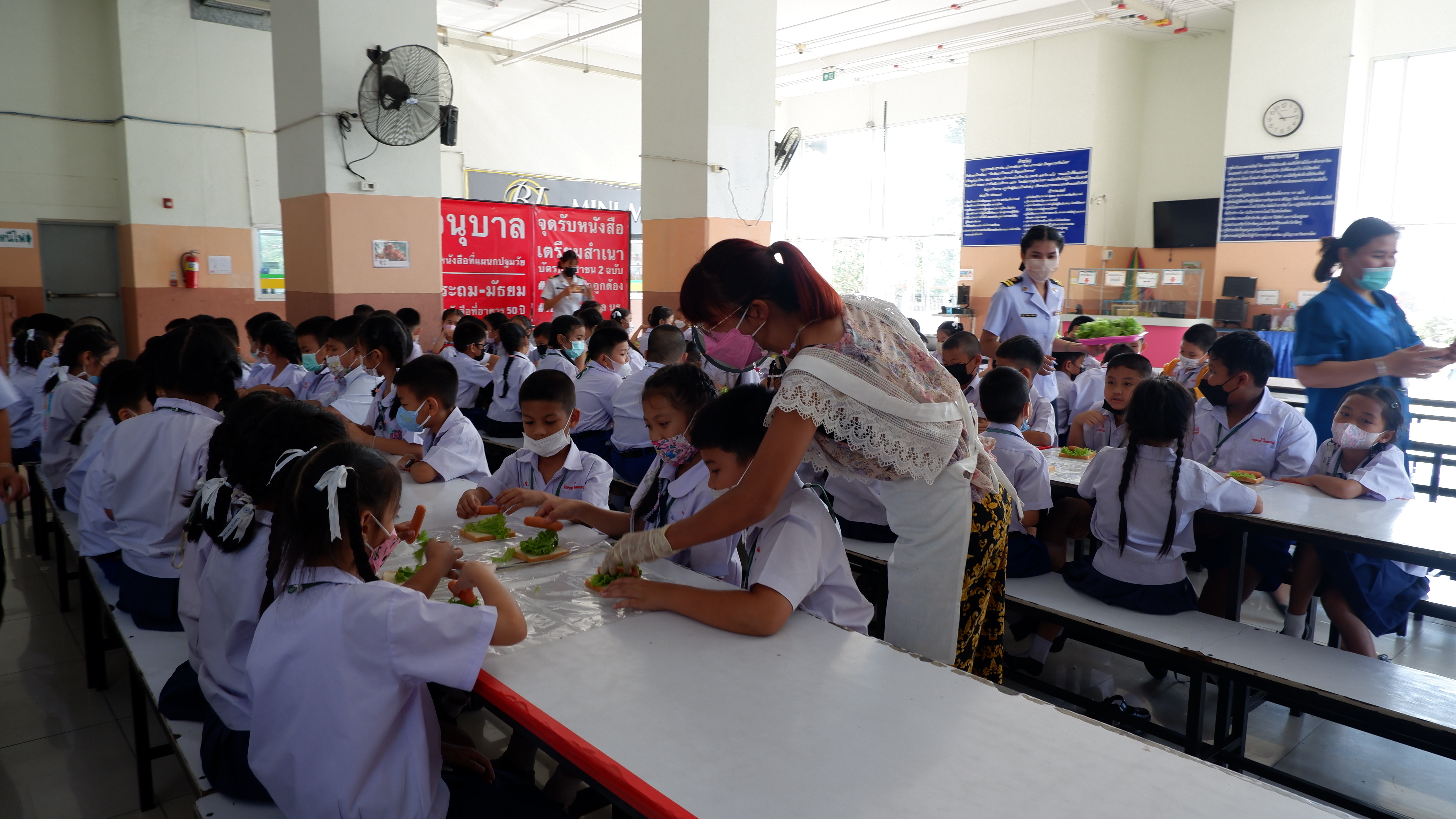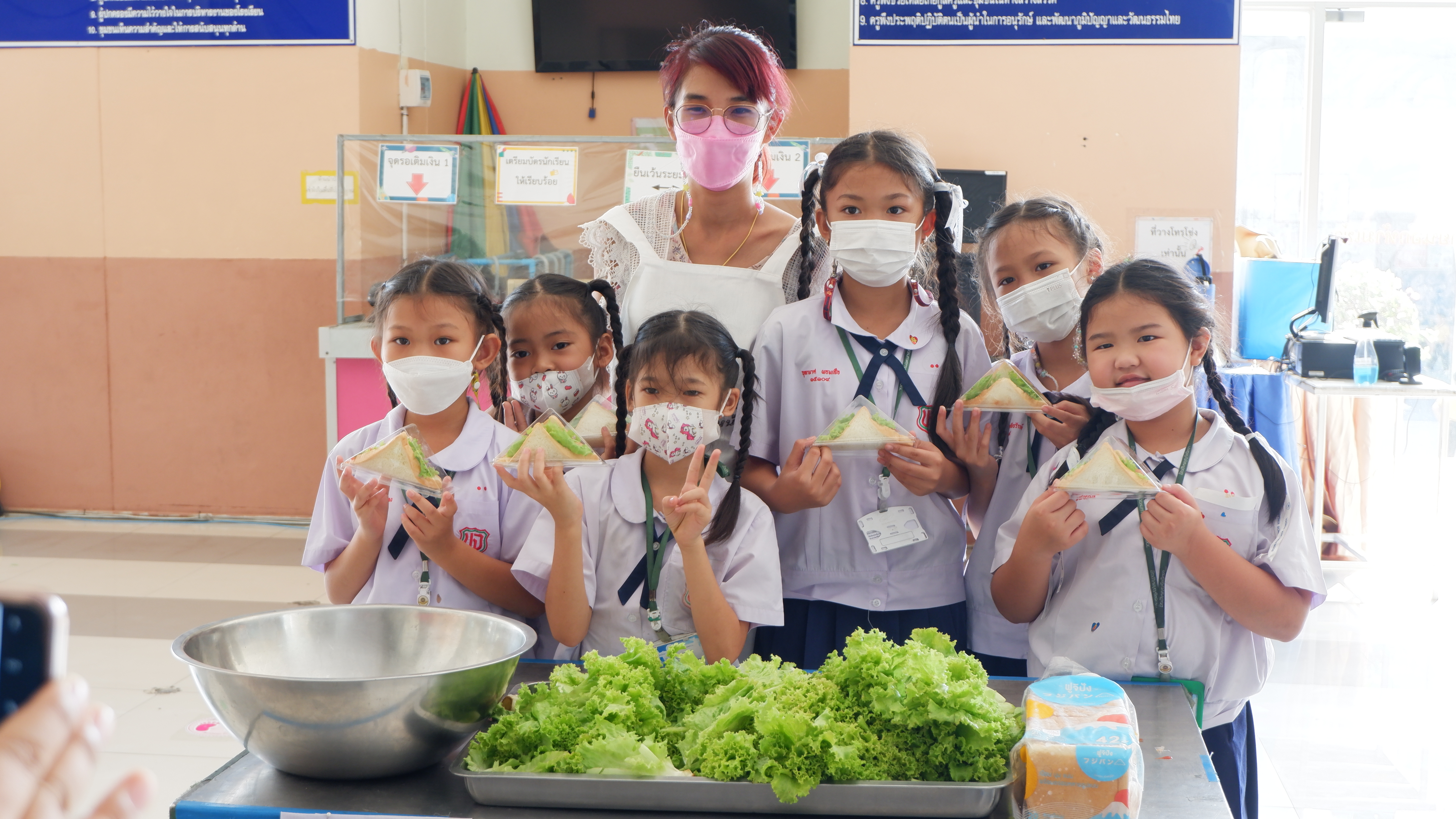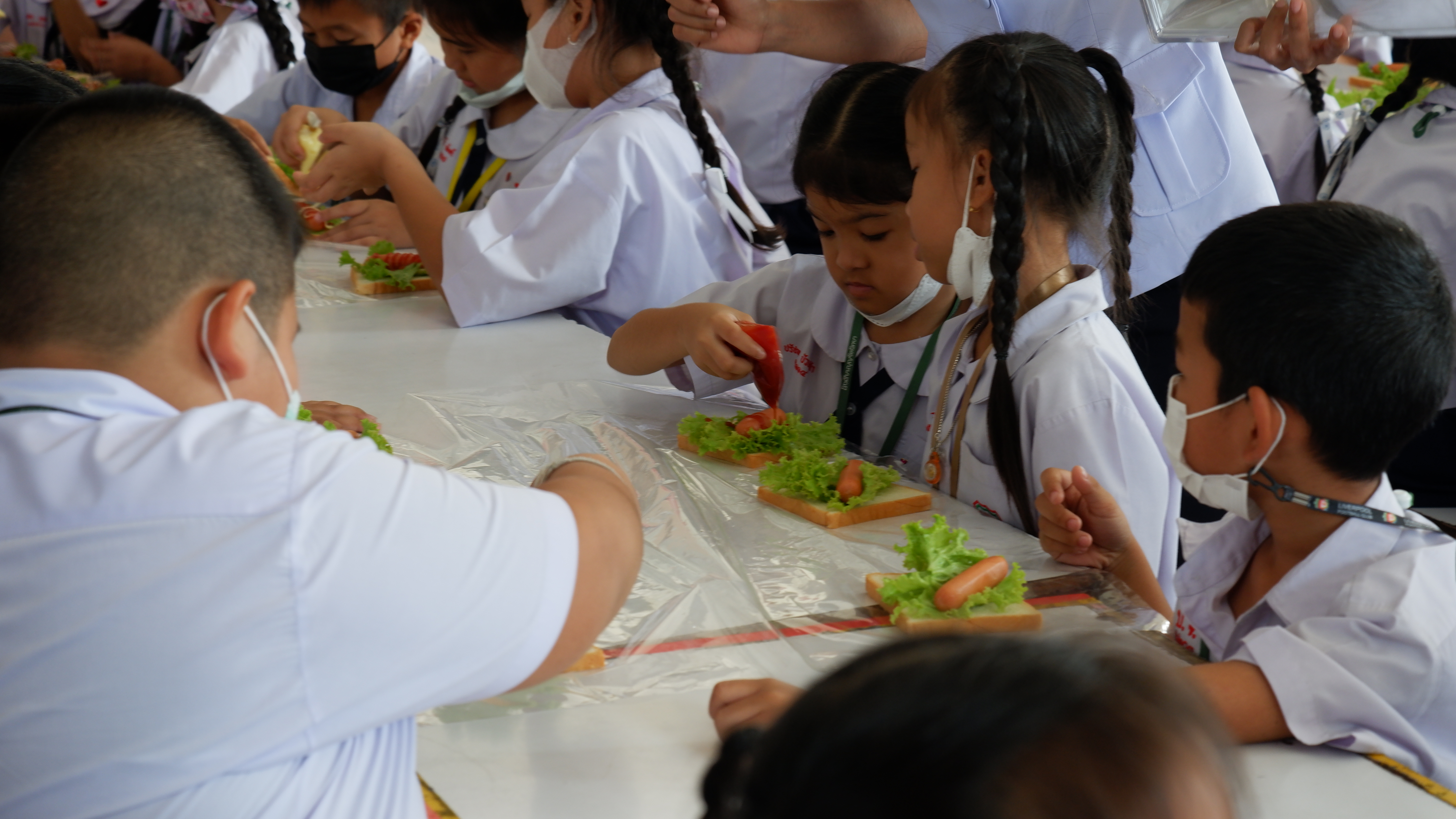 วันจันทร์ที่ 13 กุมภาพันธ์ 2566 กิจกรรมหนึ่งครูหนึ่งวิทยากรการทำแซนวิช นักเรียนชั้นประถมศึกษาที่ 3 การทำแซนวิช ณโรงอาหารอาคาร 50ปี