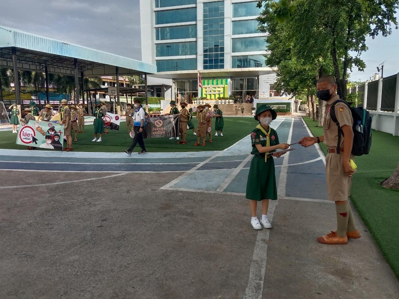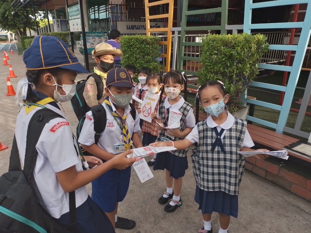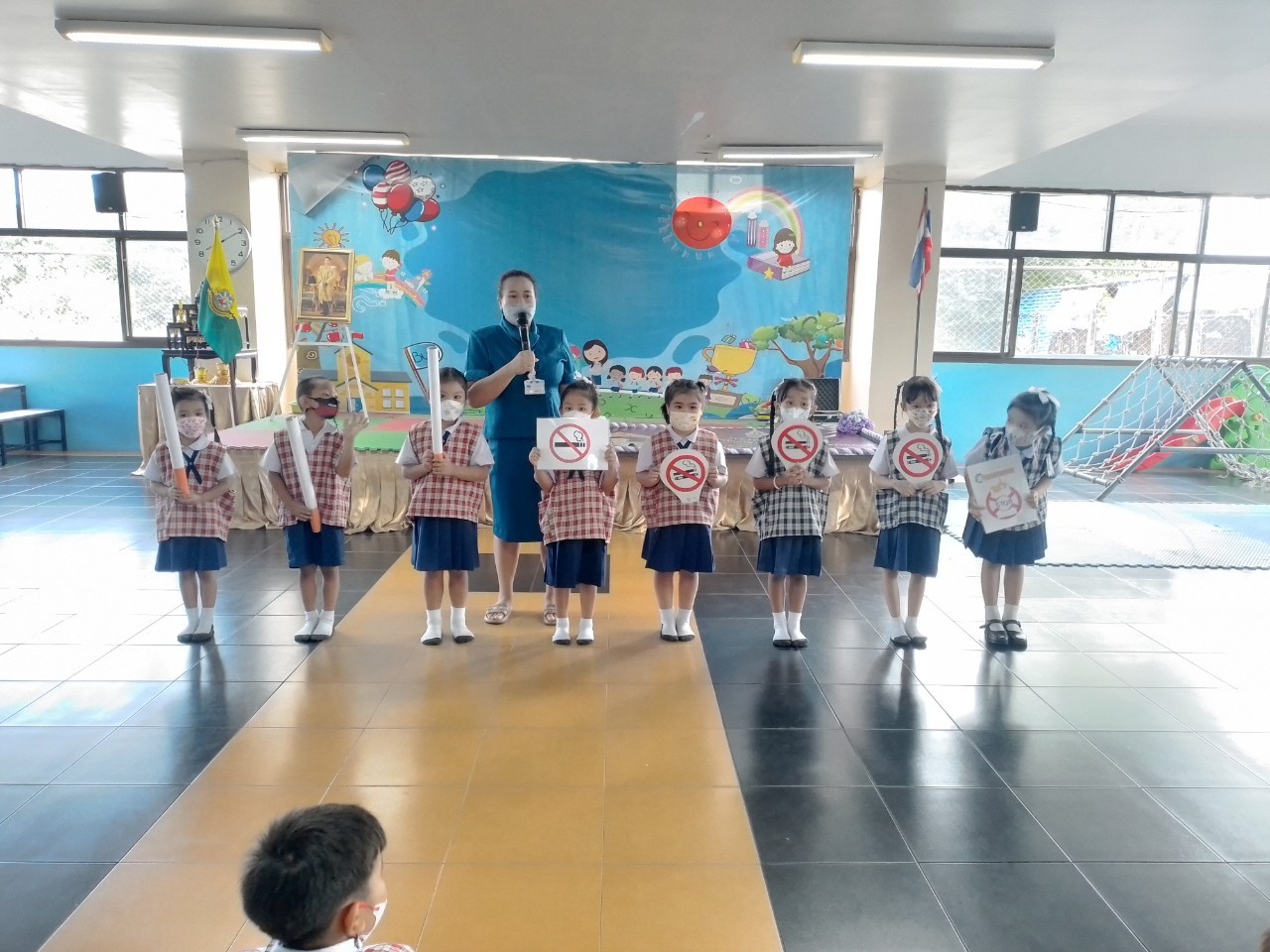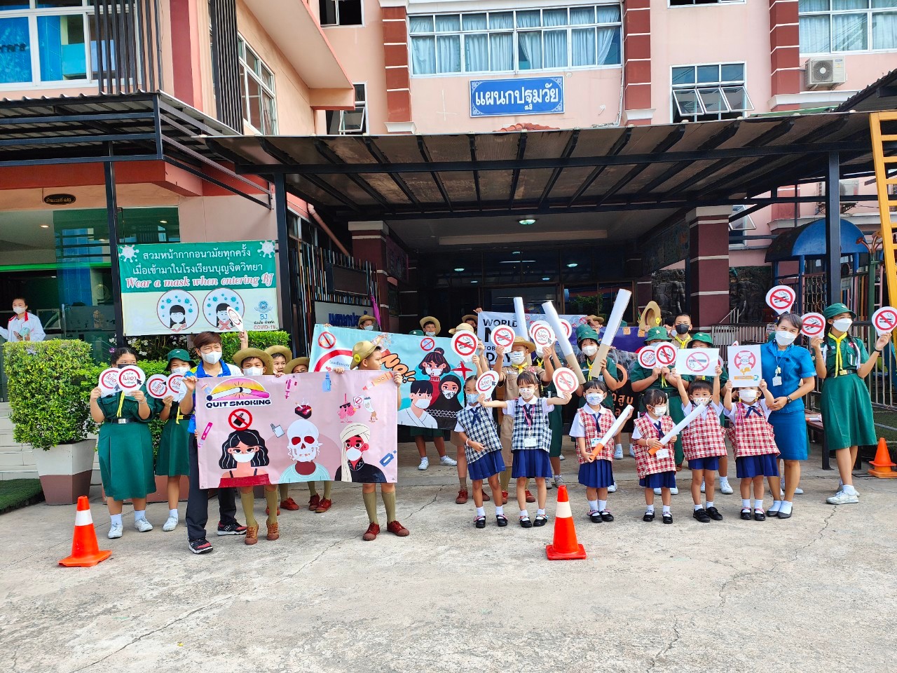 -กิจกรรมนักเรียนระดับชั้นปฐมวัยและประถมศึกษาถือป้ายรณรงค์งดสูบบุหรี่และการเเจกโบรชัวร์ให้กับนักเรียนเเละผู้ปกครอง