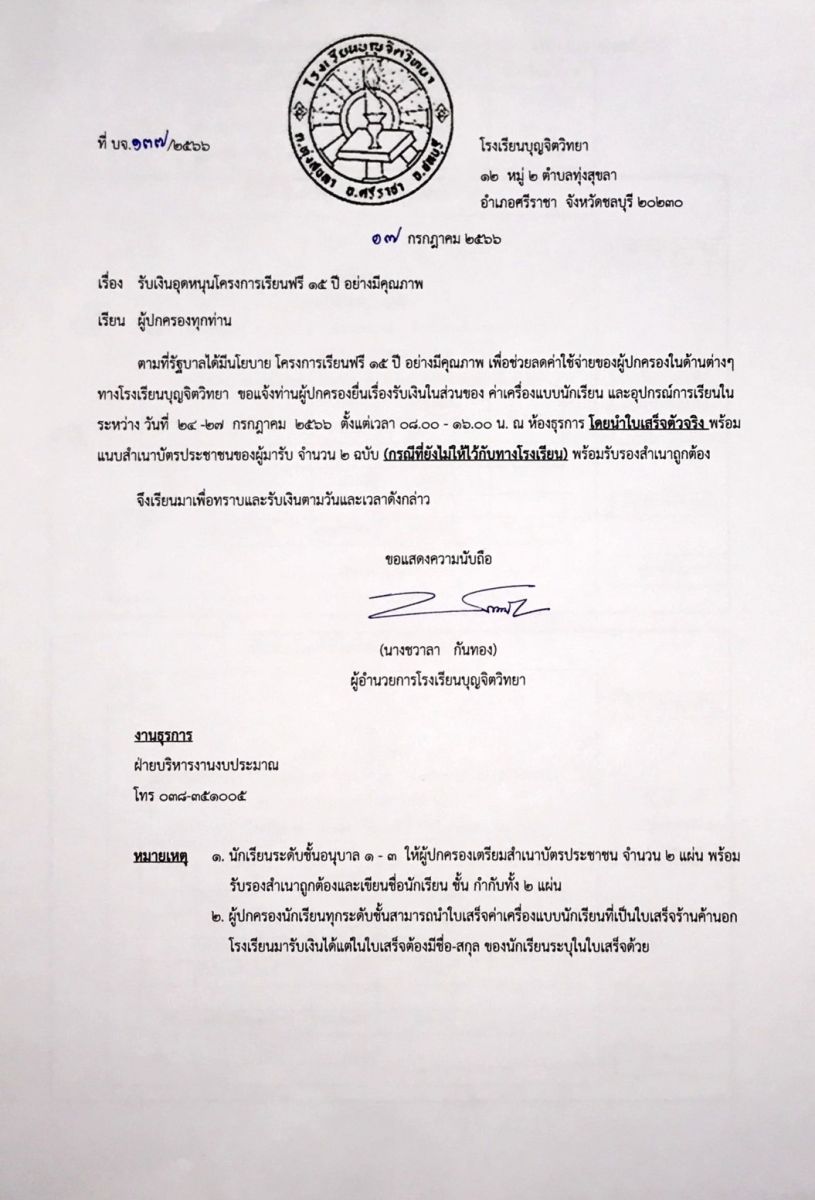การรับเงินโครงการเรียนฟรี 15 ปี อย่างมีคุณภาพ ทางโรงเรียนบุญจิตวิทยา ขอแจ้งท่านผุ้ปกครองยื่นเรื่องรับเงินในส่วนของค่าเครื่องแบบนักเรียน และอุปกรณ์การเรียน โดยนำใบเสร็จตัวจริง พร้อมแนบสำเนาบัตรประชาชนของผู้มารับจำนวน 2 ฉบับ ( กรณีที่ยังไม่ให้ไว้กับทางโรงเรียน ) พร้อมรับรองสำเนาถูกต้อง ในวันที่ 24-27 กรกฎาคม 2566 ตั้งแต่เวลา 8.00น. - 16.00น. ณ ห้องธุรการ