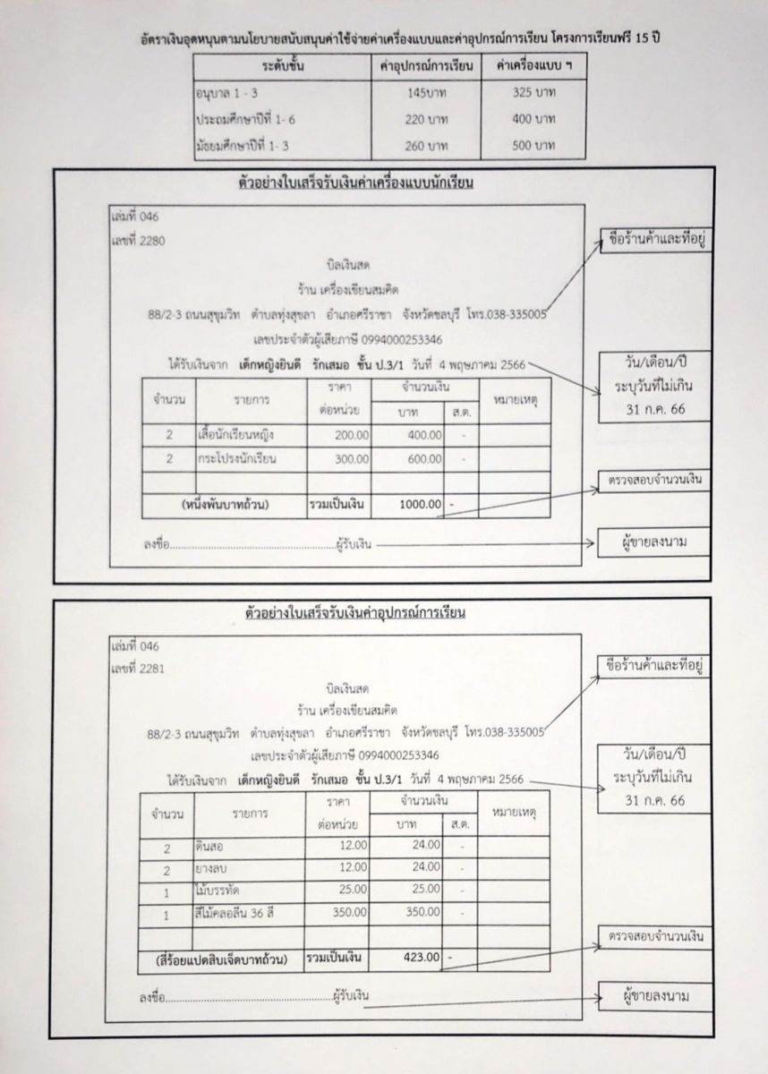*นักเรียนระดับชั้นอนุบาล 1-3 ให้ผู้ปกครองเตรียมสำเนาบัตรประชาชน จำนวน 2 แผ่น *ใบเสร็จร้านค้าภายนอกโรงเรียน ต้องมีชื่อ-นามสกุลของนักเรียนระบุด้วย