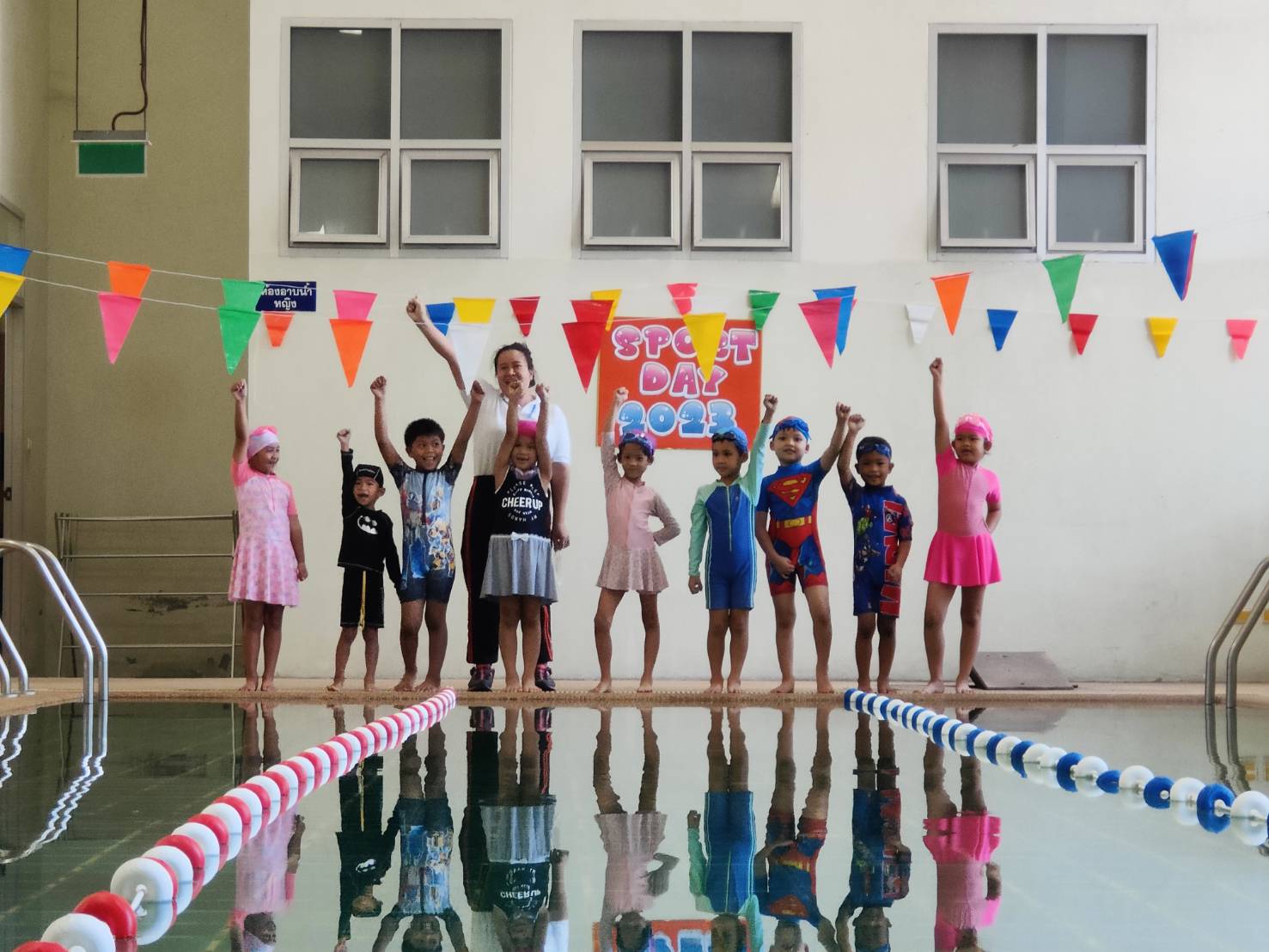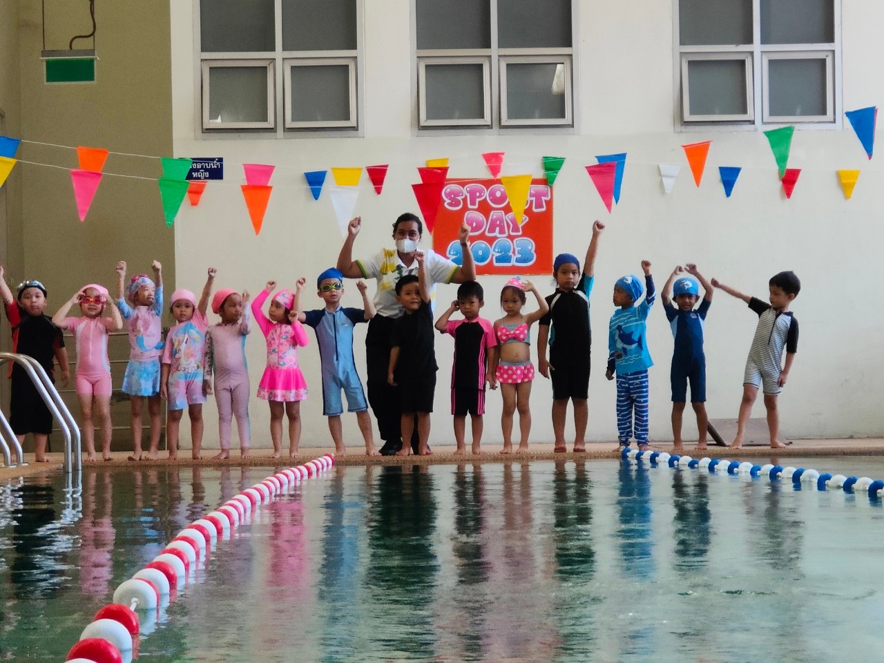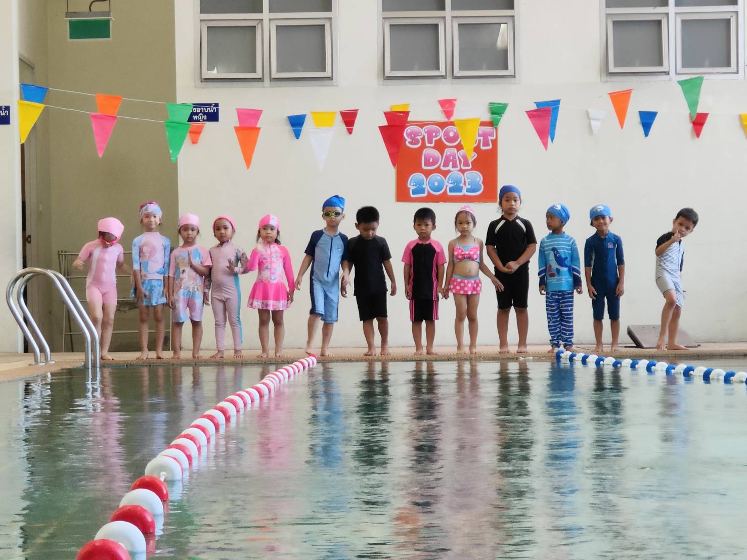 นักเรียนระดับชั้นอนุบาล 1-3ร่วมกันแข่งขันกีฬาว่ายน้ำ ประเภทหญิงเดี่ยวและชายเดี่ยว ณ สระว่ายน้ำ อาคาร 50 ปี