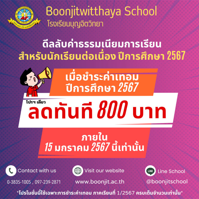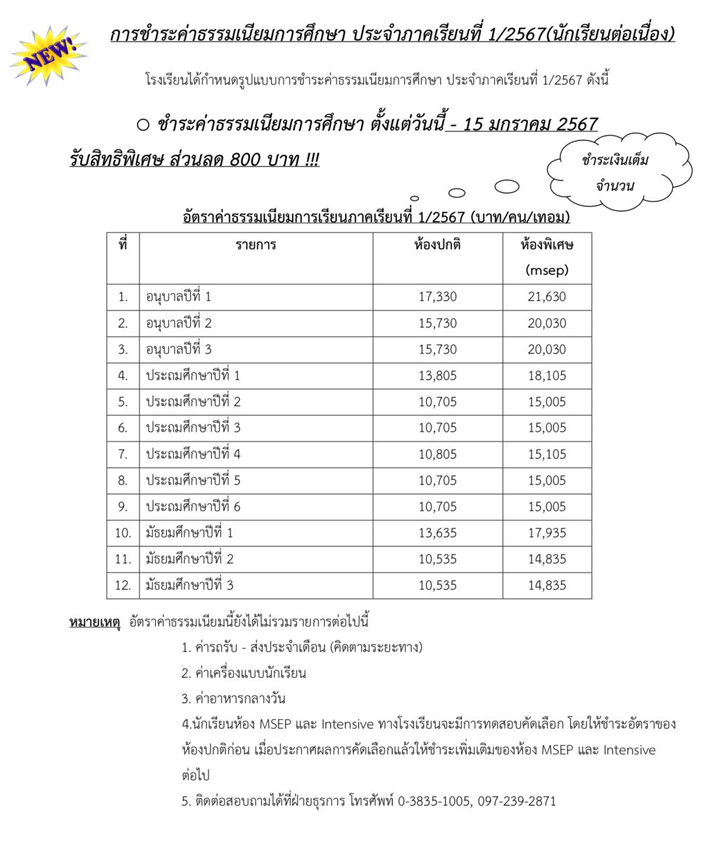 ค่าธรรมเนียมการเรียน สำหรับนักเรียนต่อเนื่อง ปีการศึกษา 2567