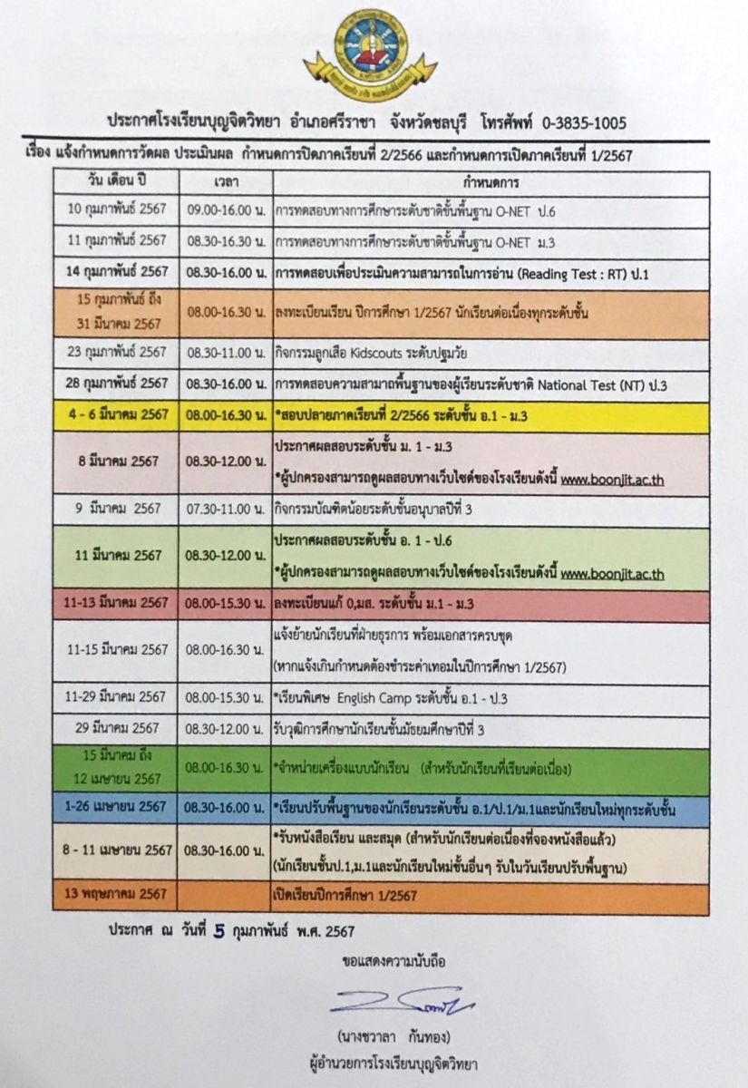 แจ้งกำหนดการวัดผล ประเมินผล กำหนดการปิดภาคเรียนที่ 2/2566 และ กำหนดการเปิดภาคเรียนที่ 1/2567