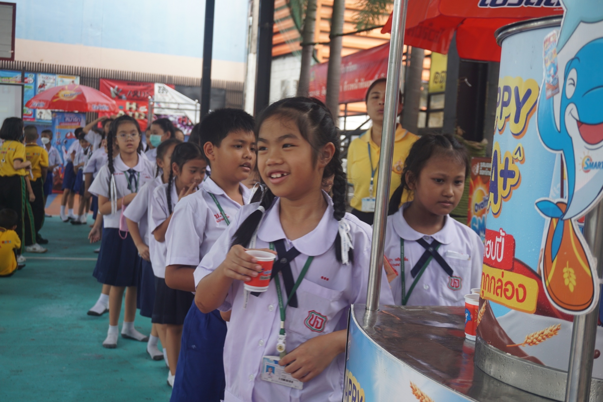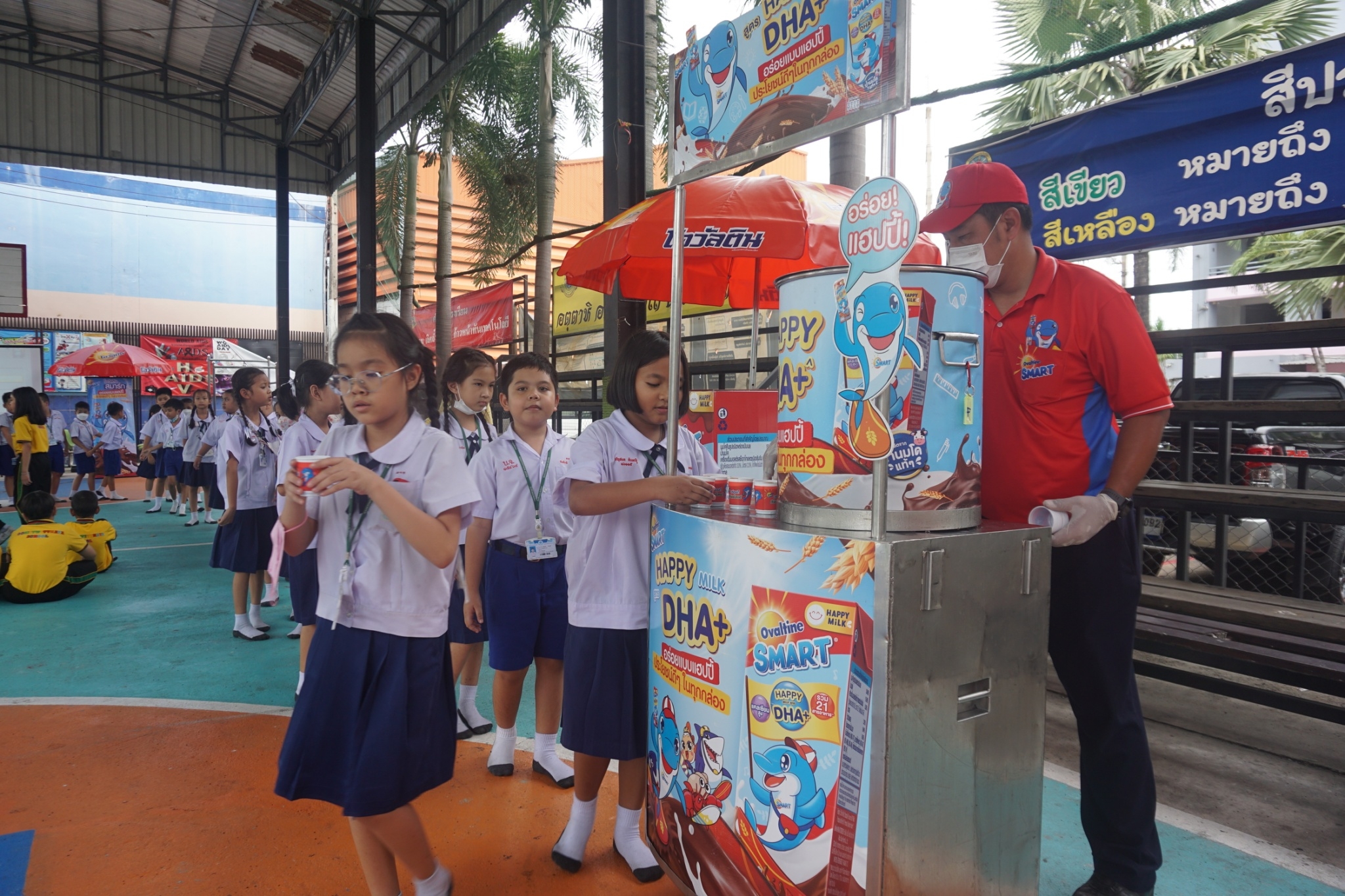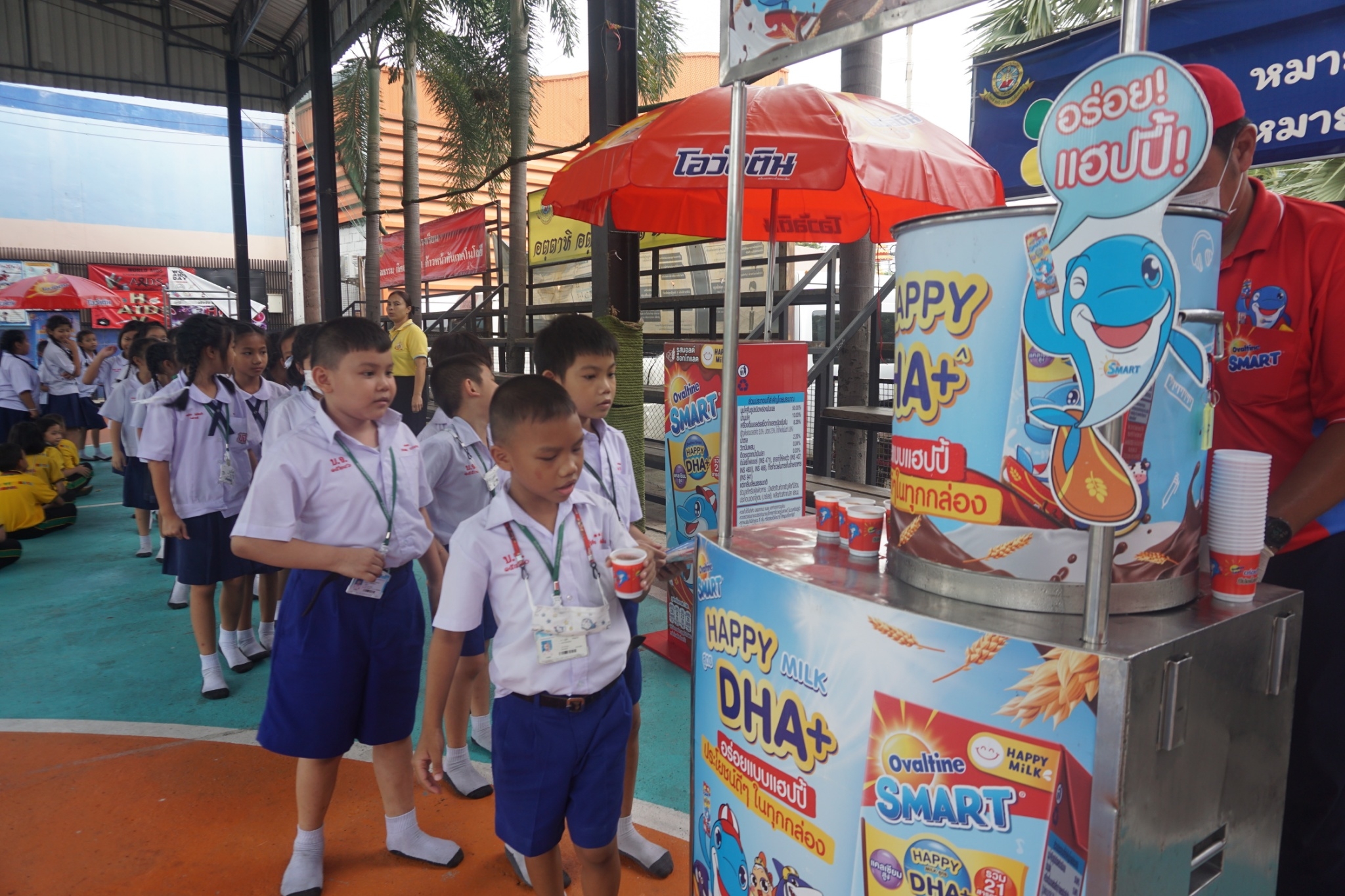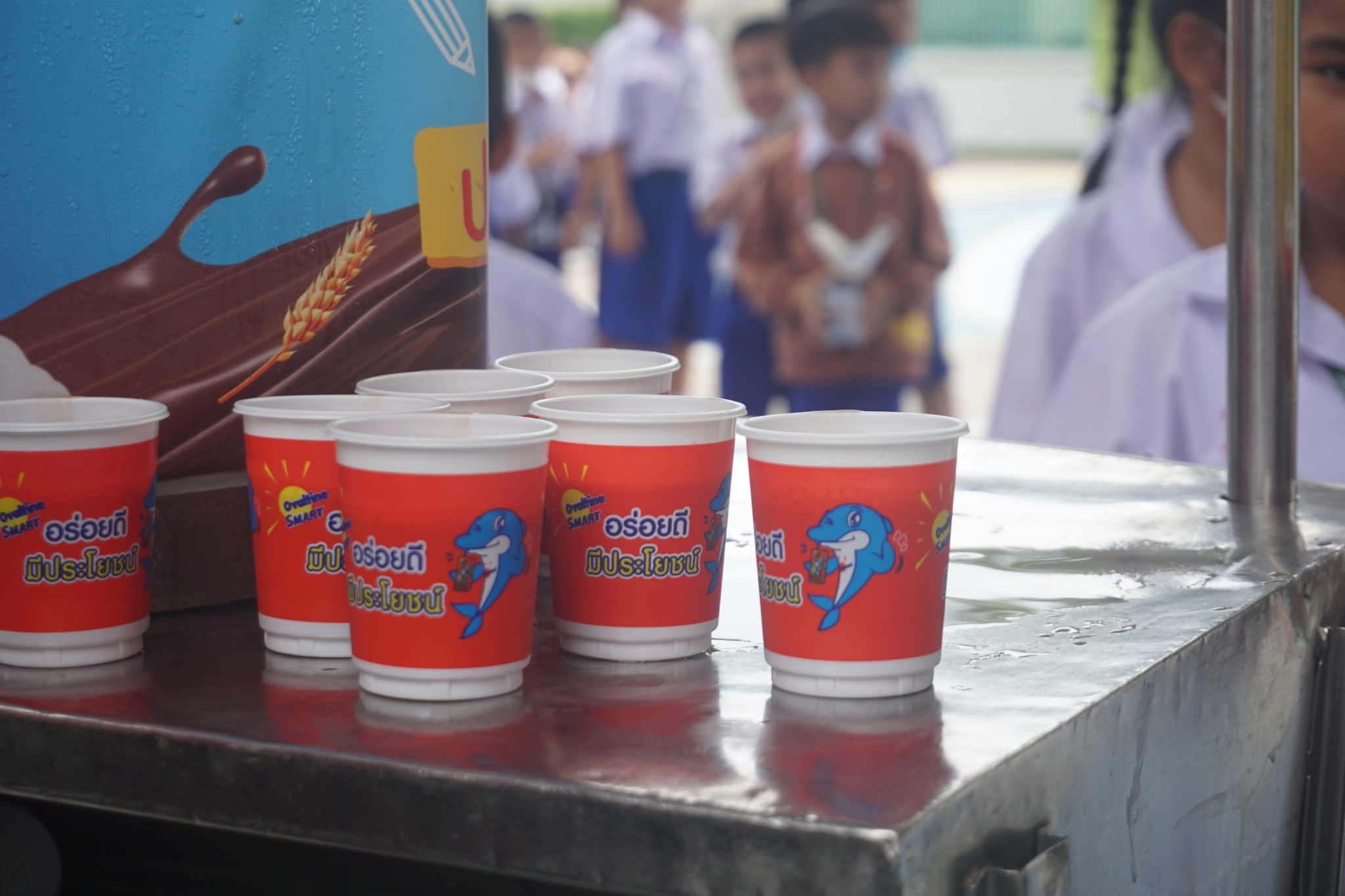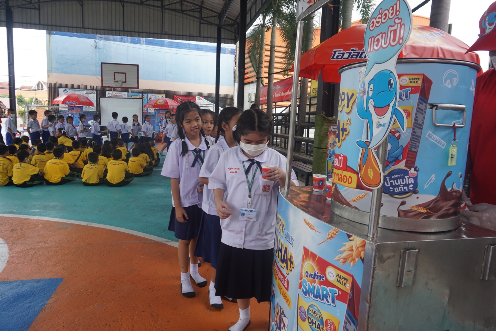 แบบเซ็ต ให้นักเรียนระดับชั้นอนุบาล 1-3 และแจกเครื่องดื่มโอวัลตินแบบชง ให้นักเรียนชั้นประถมศึกษาปีที่ 1-3