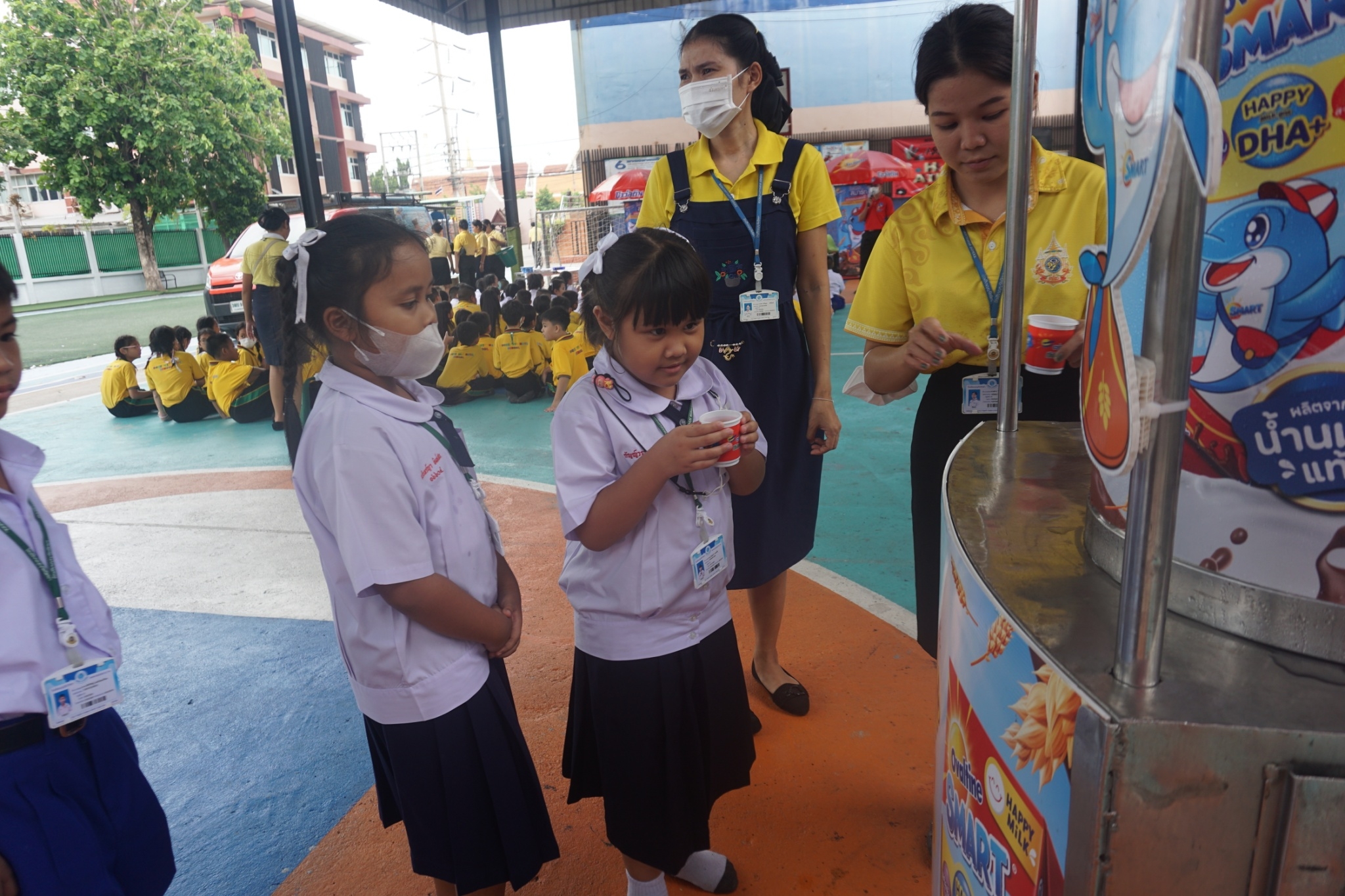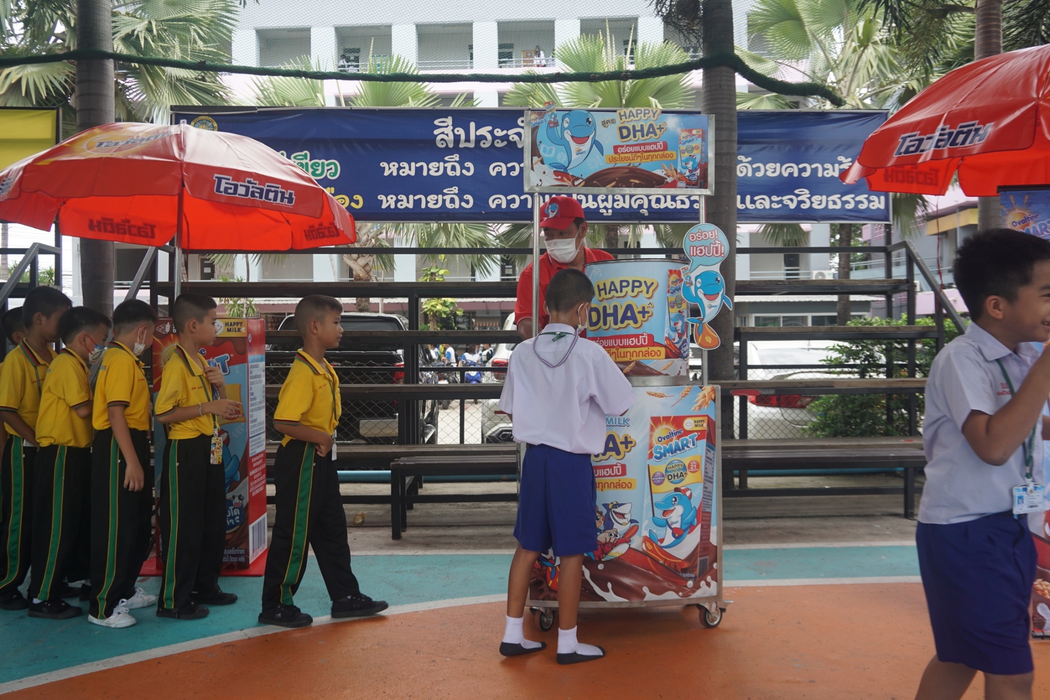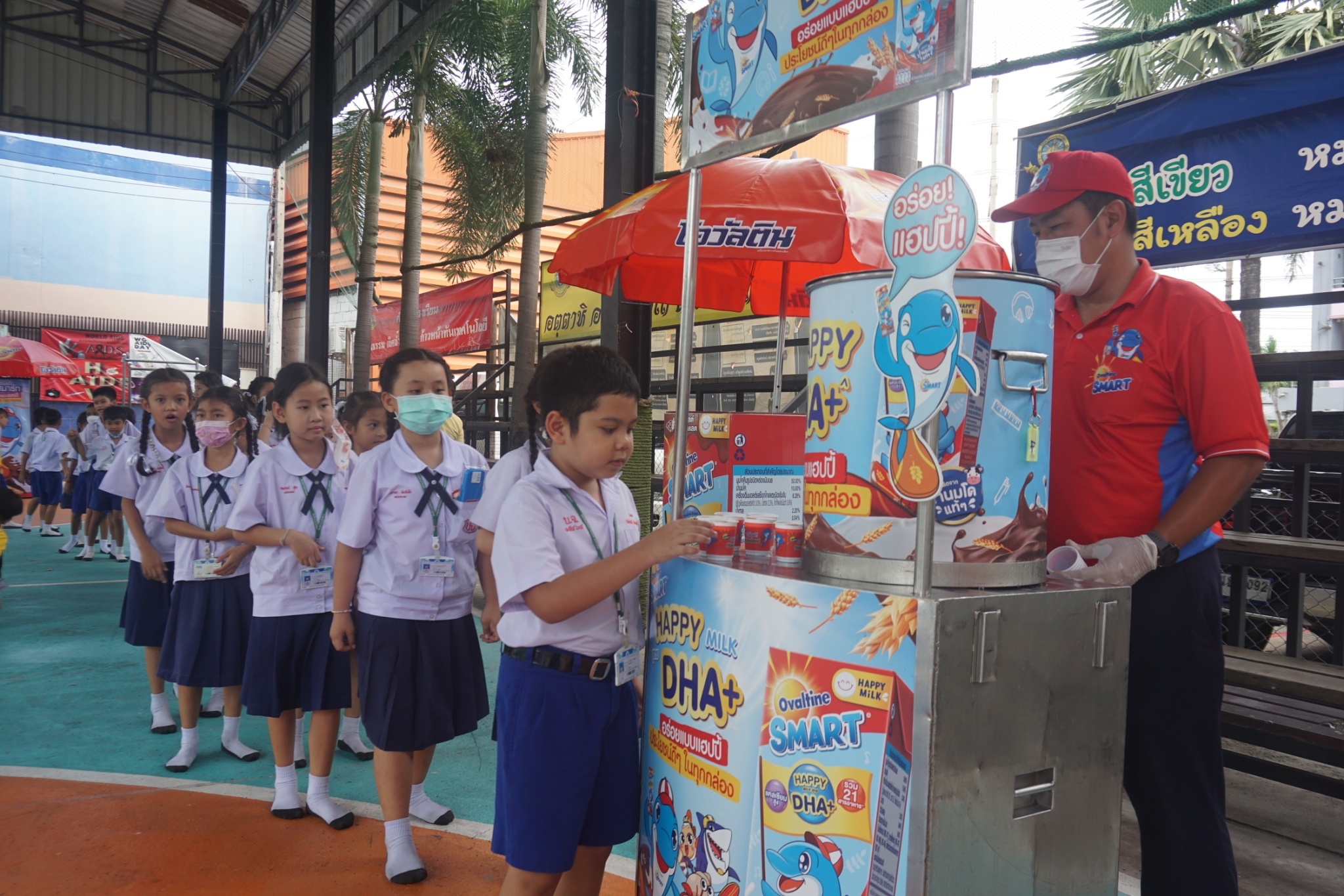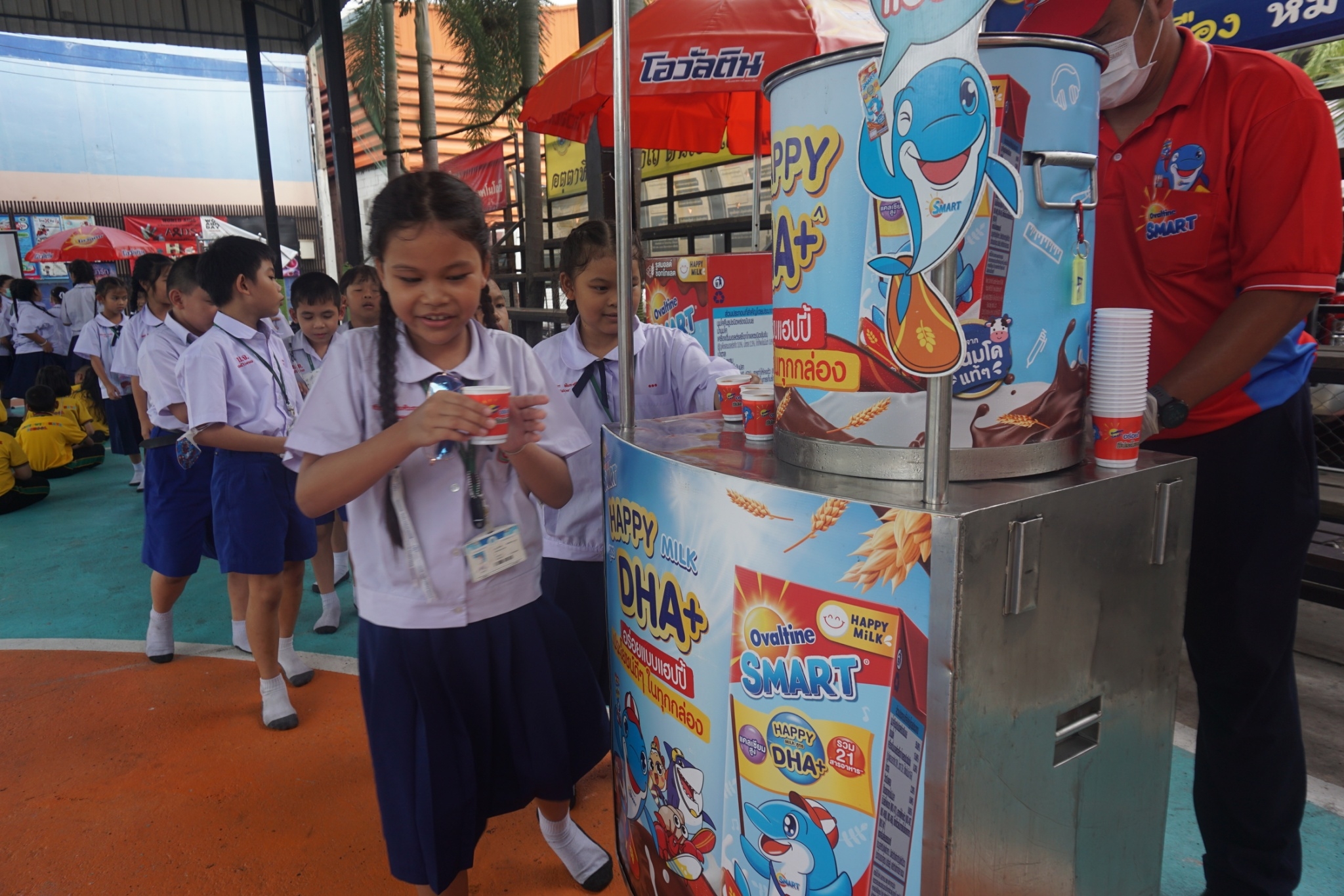 แบบเซ็ต ให้นักเรียนระดับชั้นอนุบาล 1-3 และแจกเครื่องดื่มโอวัลตินแบบชง ให้นักเรียนชั้นประถมศึกษาปีที่ 1-3