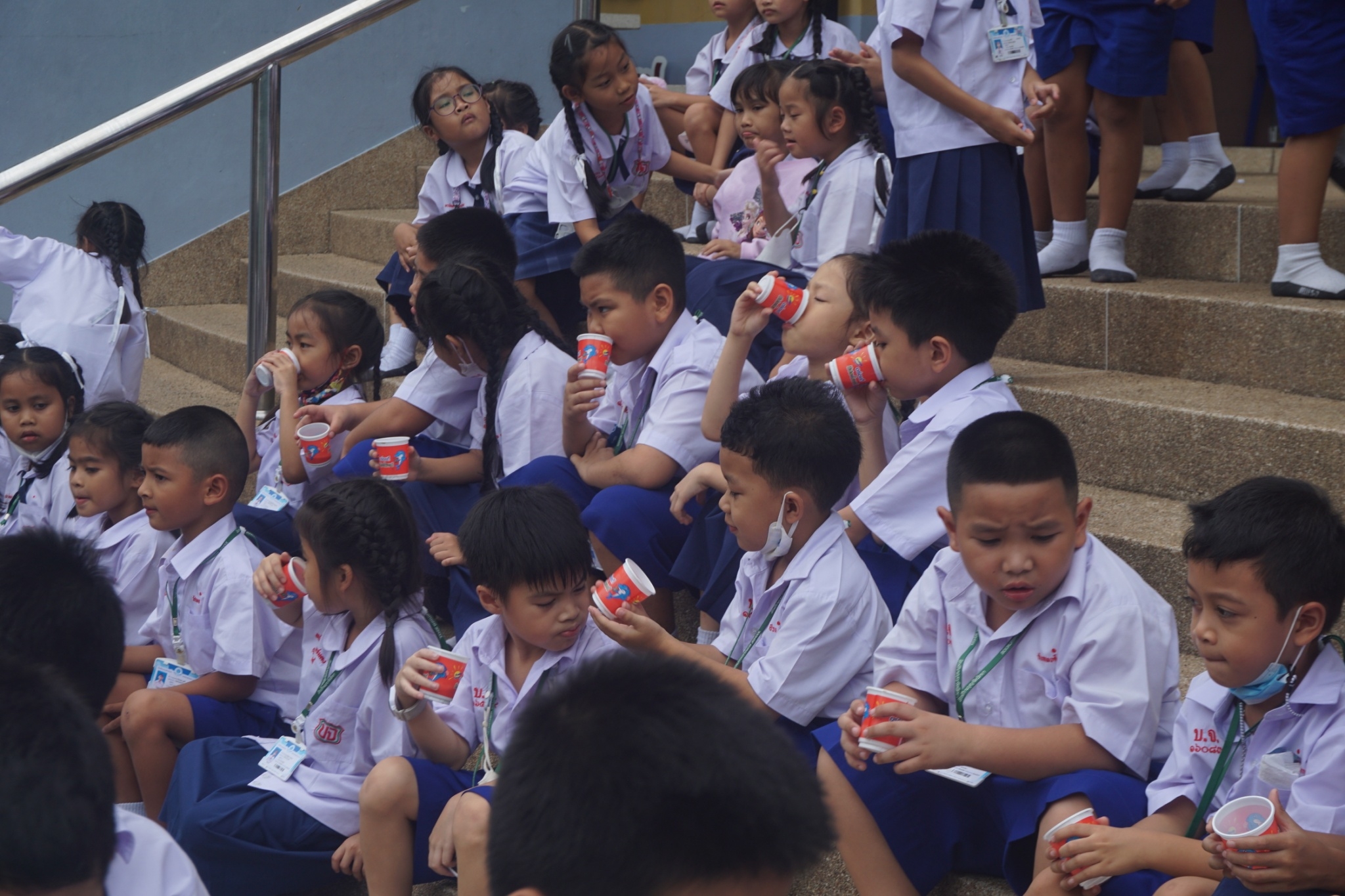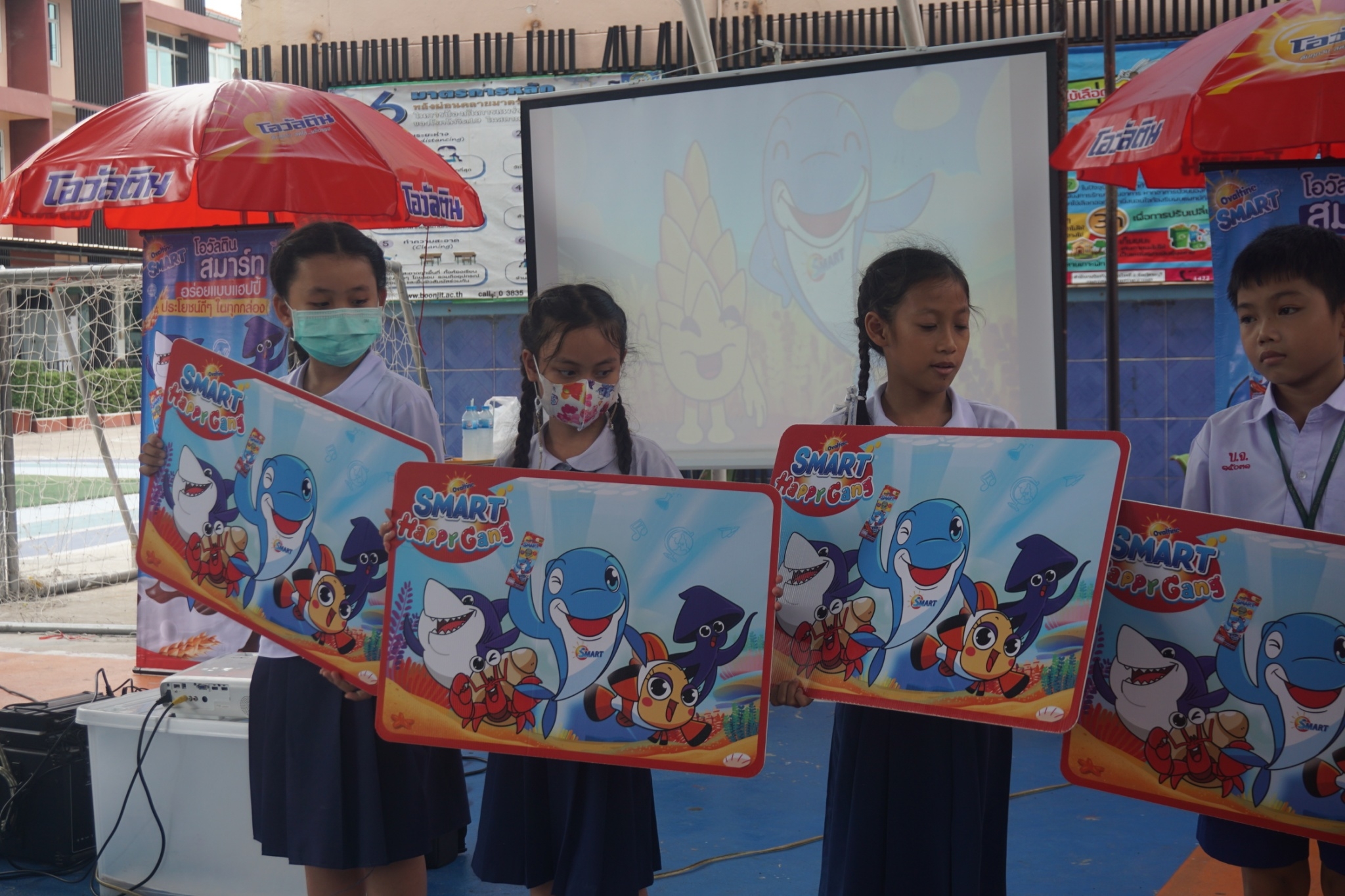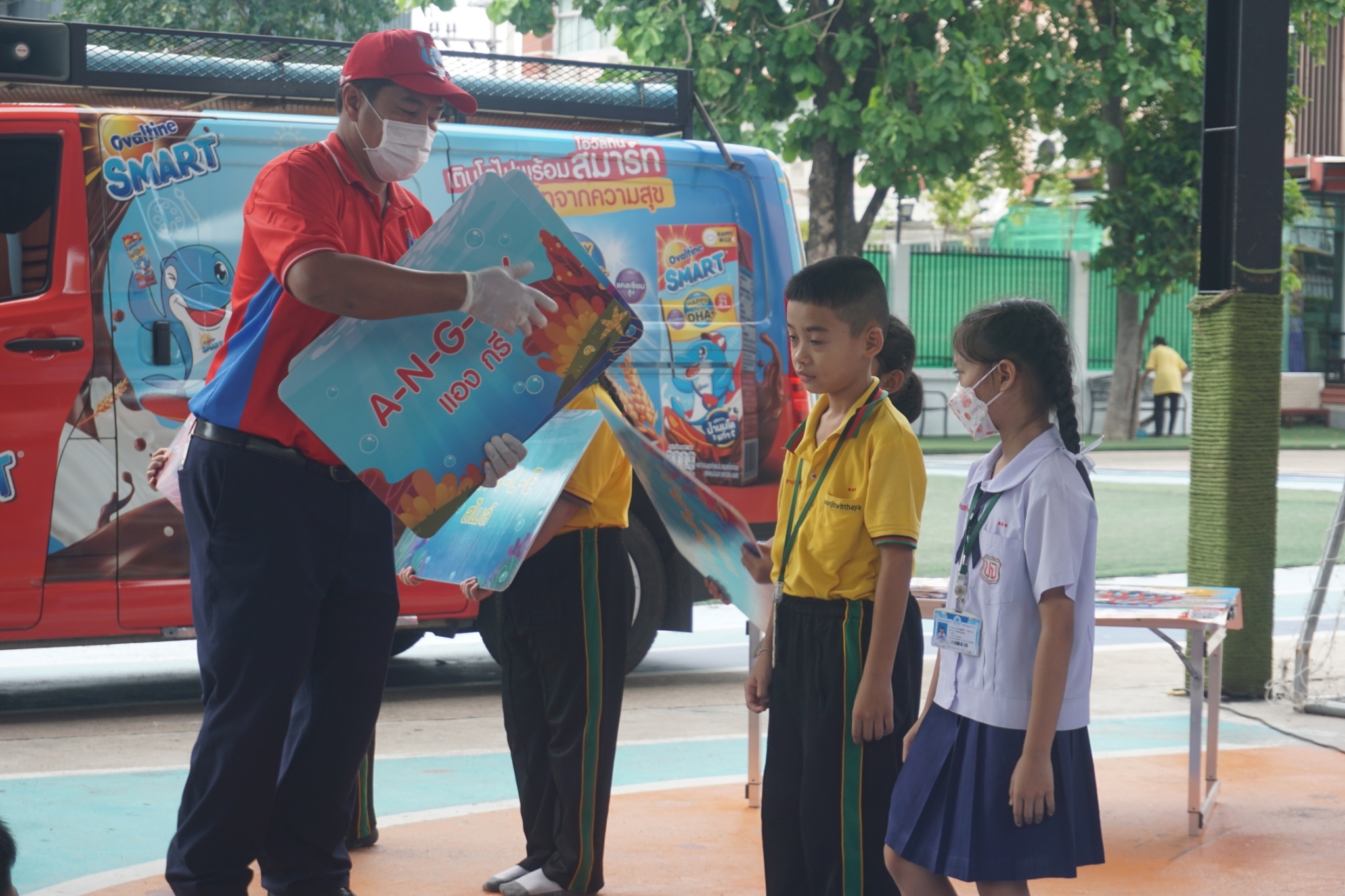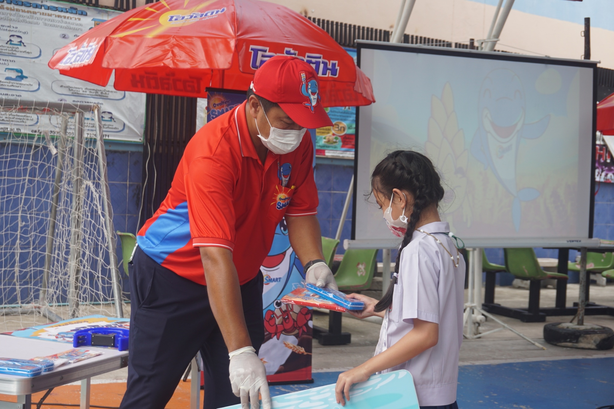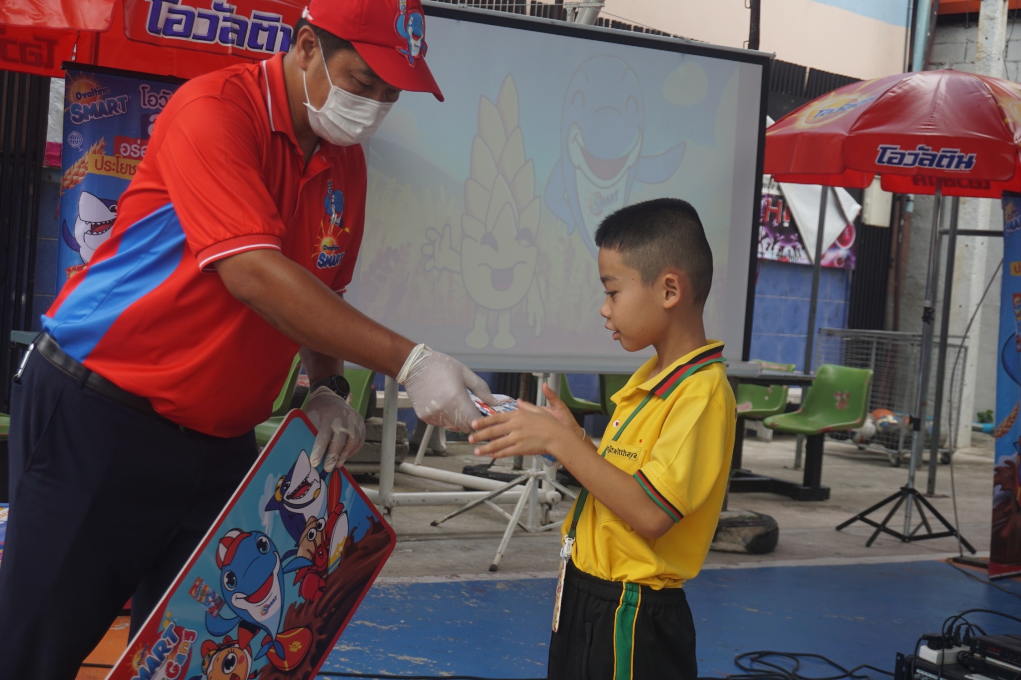 แบบเซ็ต ให้นักเรียนระดับชั้นอนุบาล 1-3 และแจกเครื่องดื่มโอวัลตินแบบชง ให้นักเรียนชั้นประถมศึกษาปีที่ 1-3