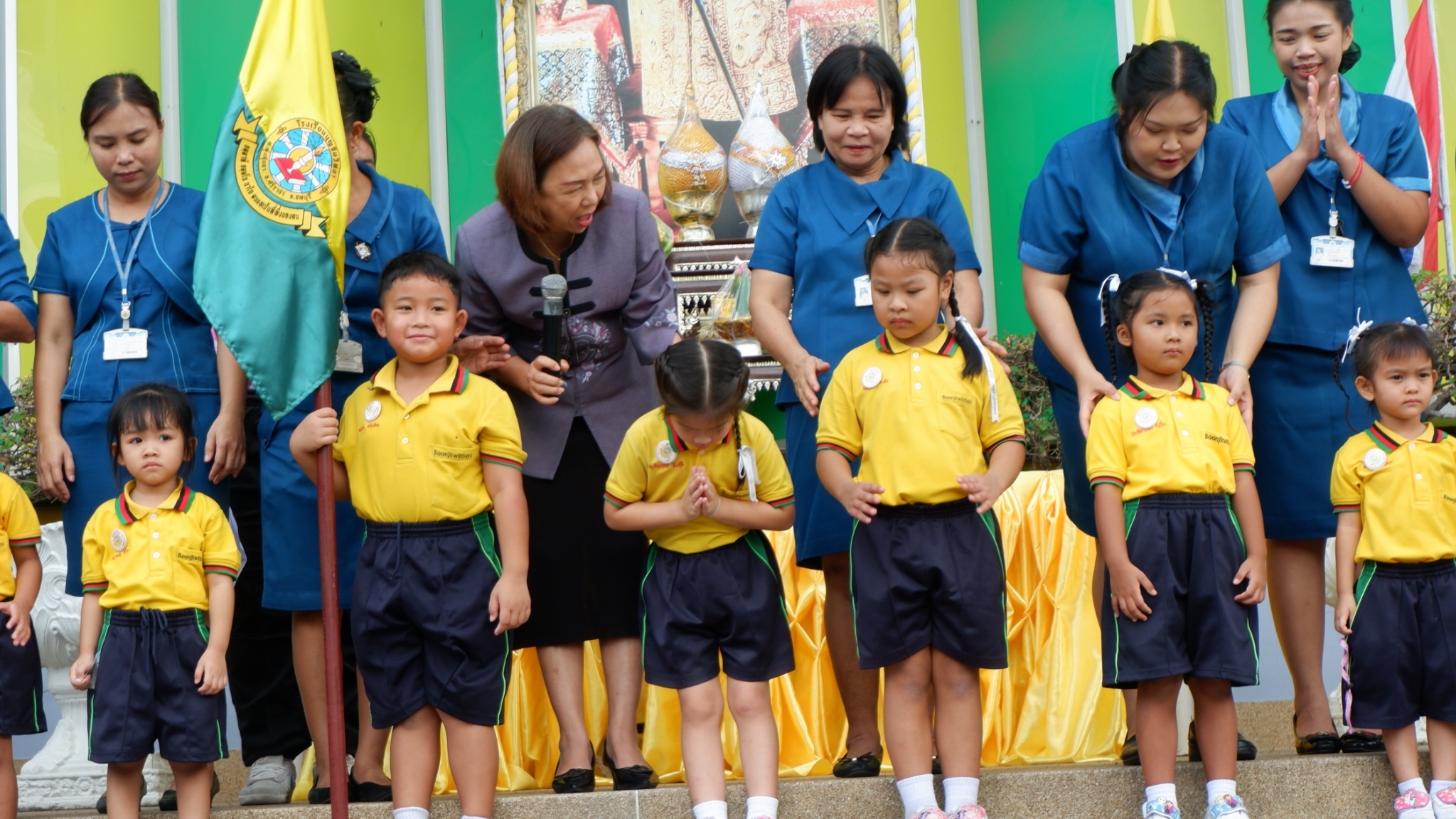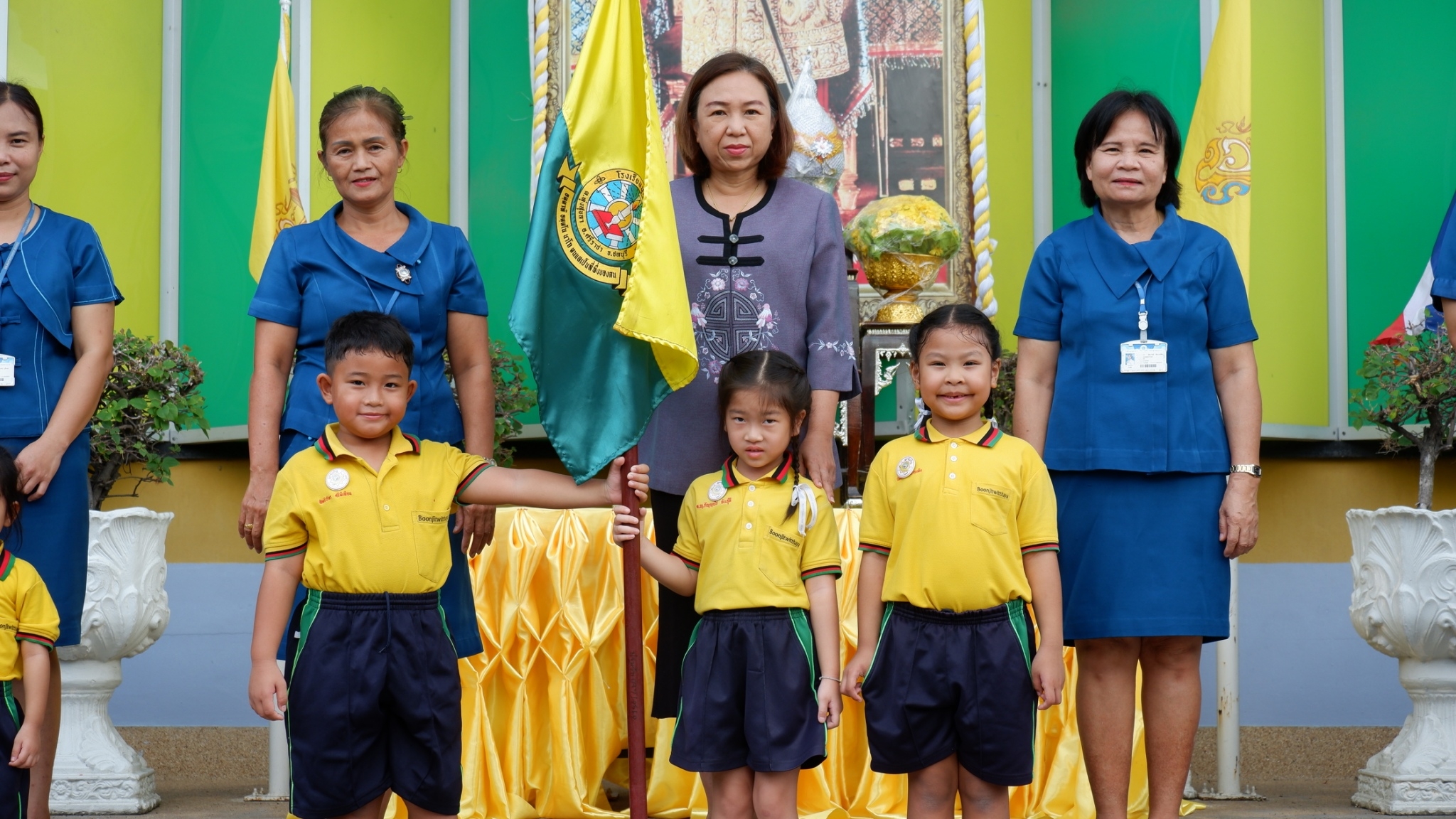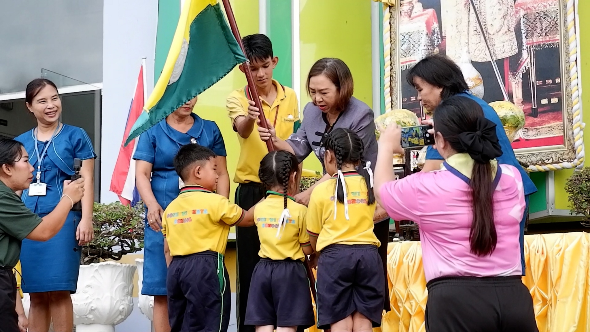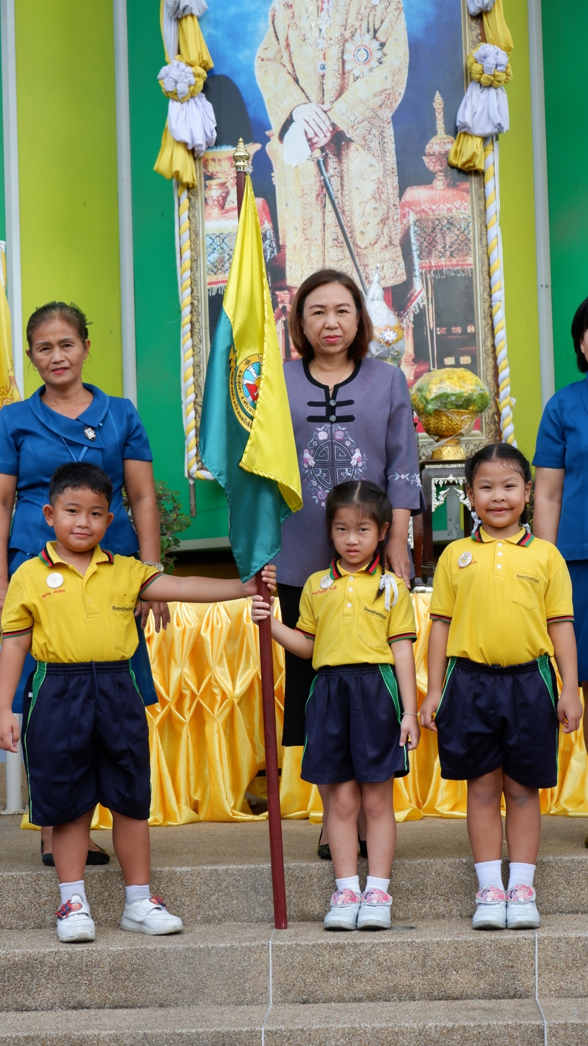 นางชวาลา กันทอง ผู้อำนวยการและคณะฝ่ายผู้บริหาร ติดเข็มให้กับสภานักเรียนระดับปฐมวัย ณ อาคาร 50 ปี