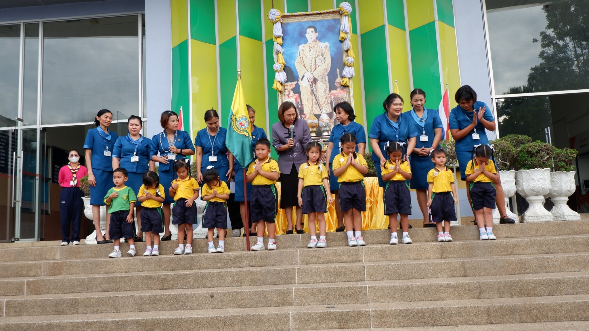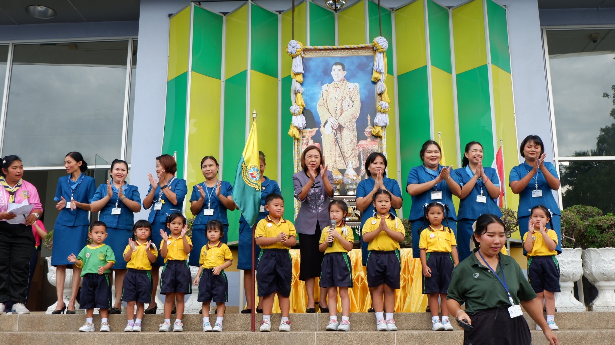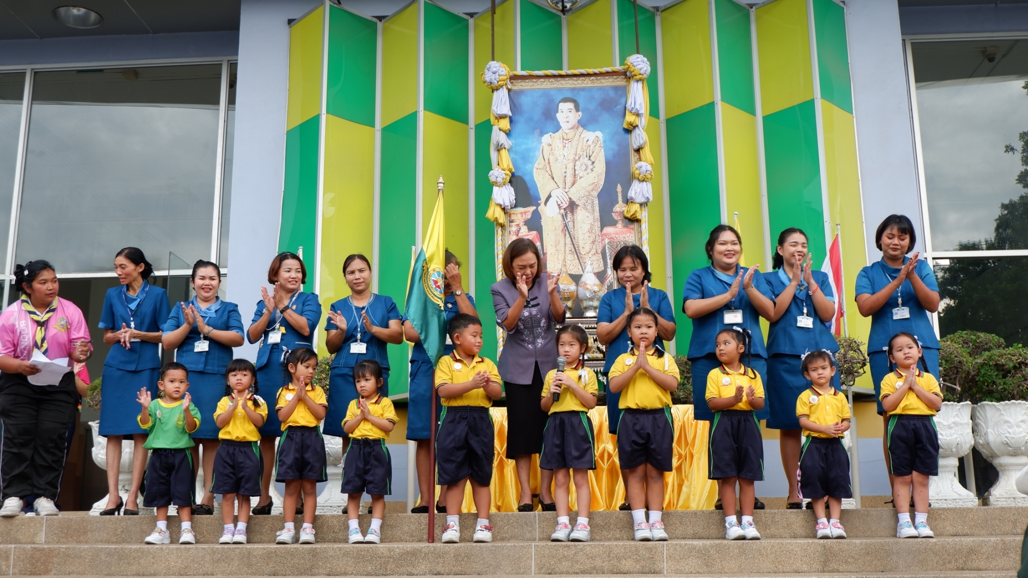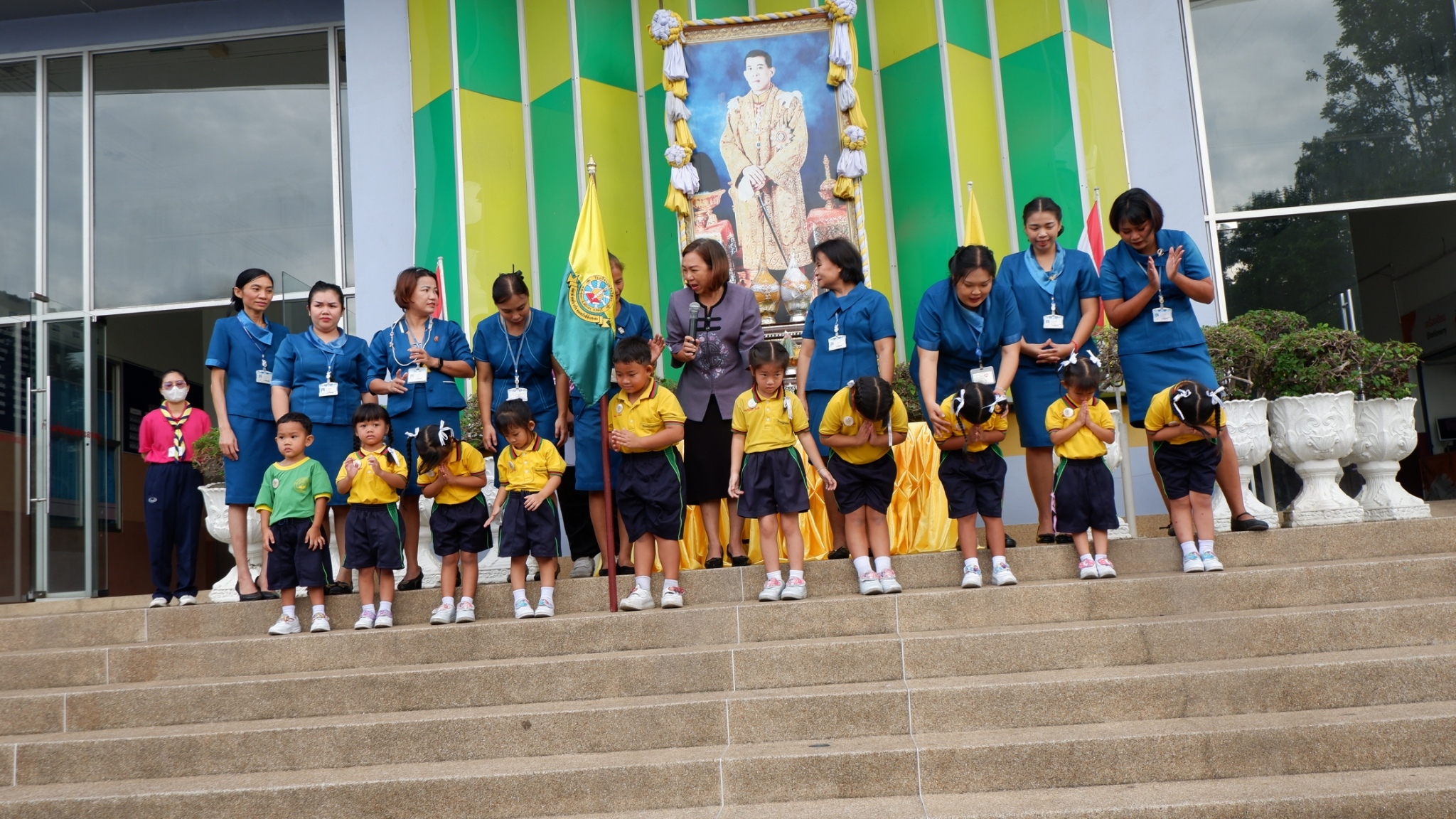 นางชวาลา กันทอง ผู้อำนวยการและคณะฝ่ายผู้บริหาร ติดเข็มให้กับสภานักเรียนระดับปฐมวัย ณ อาคาร 50 ปี