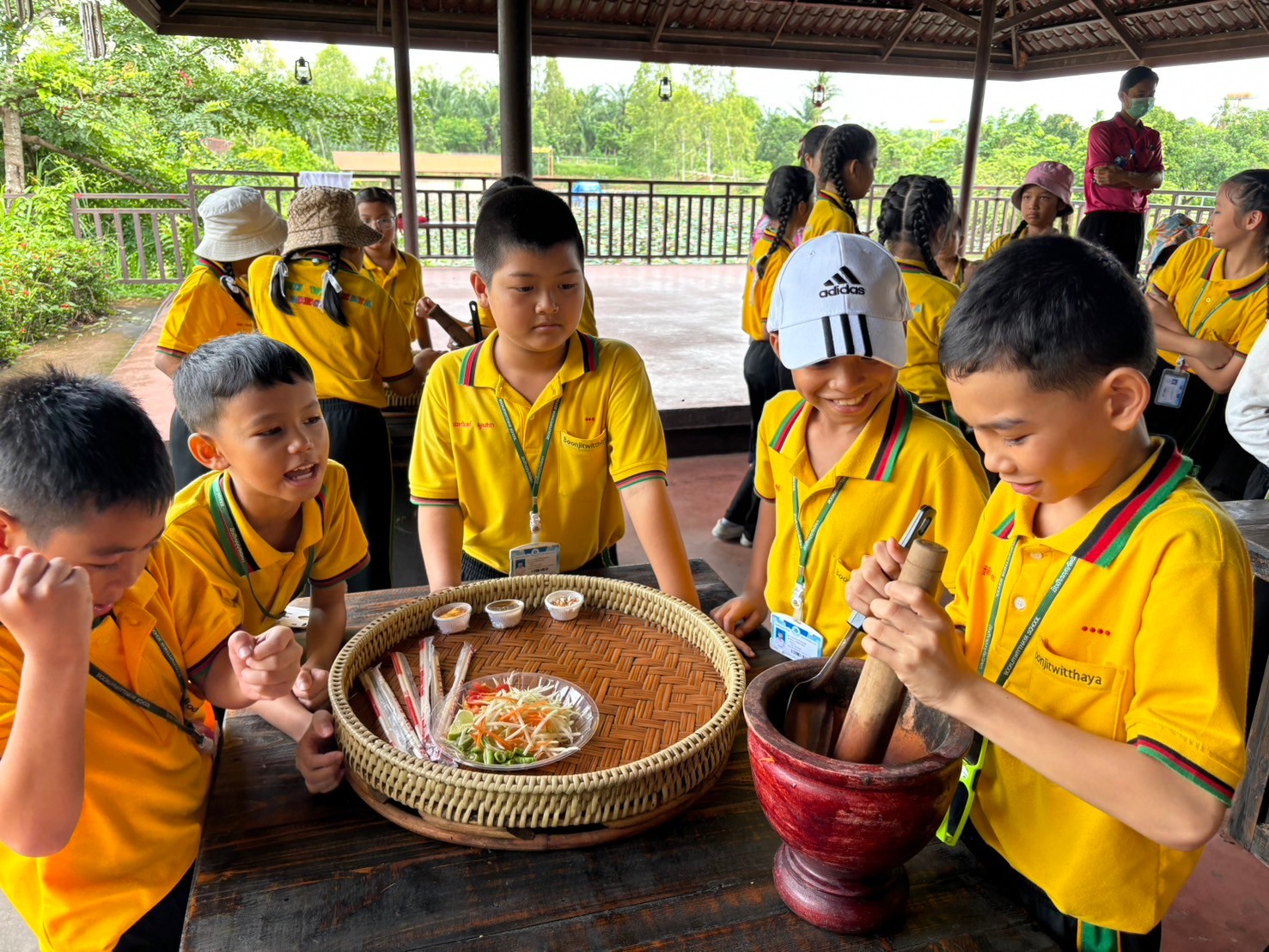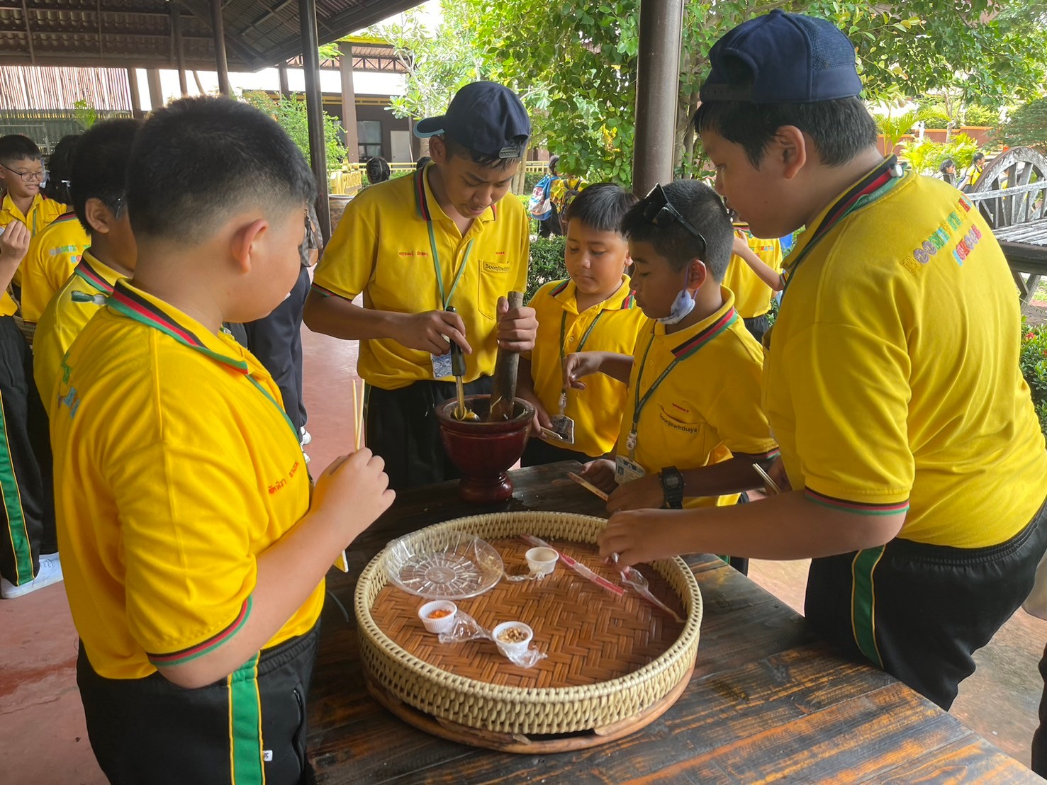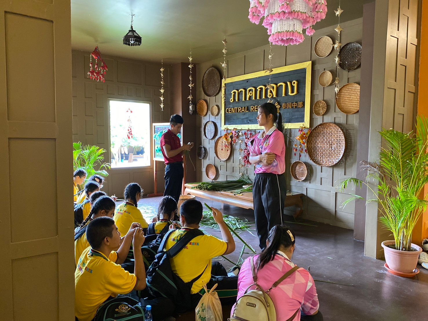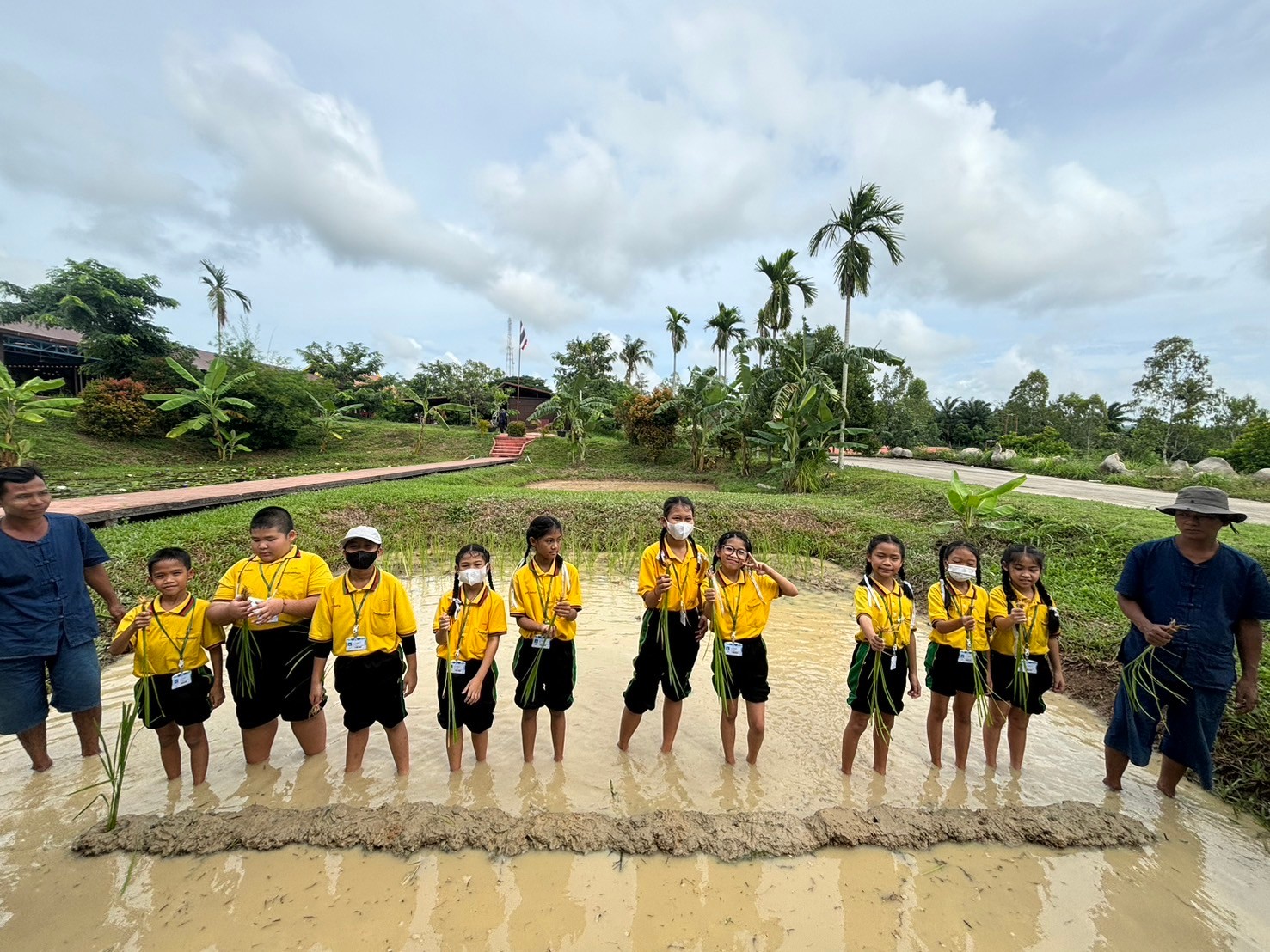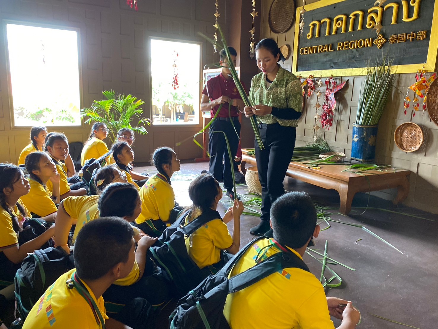 ณ สวนไทย พัทยา เกี่ยวกับการสืบสานวัฒนธรรมไทย การดำนา การสานปลาตะเพียน ทำพวงมโหตร ดูหนังตะลุง และภูมิปัญญาไทย