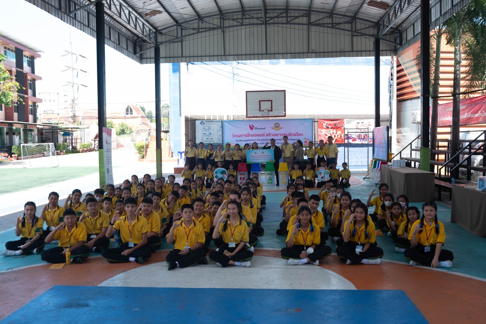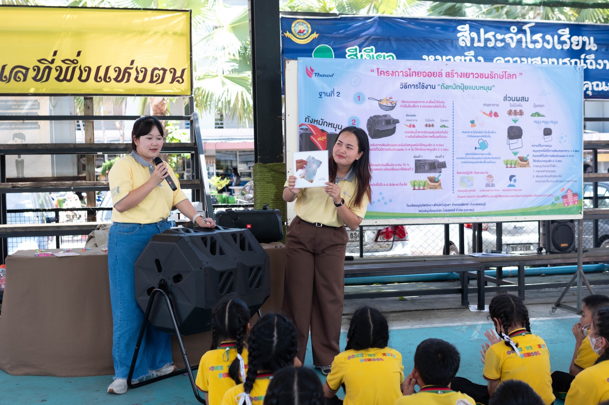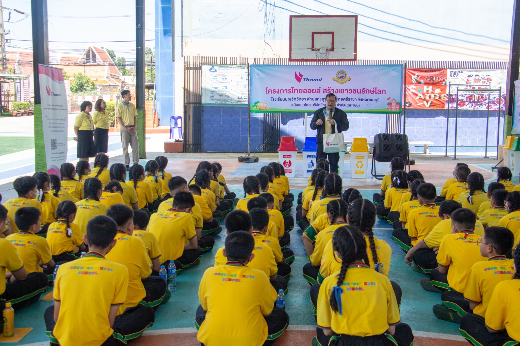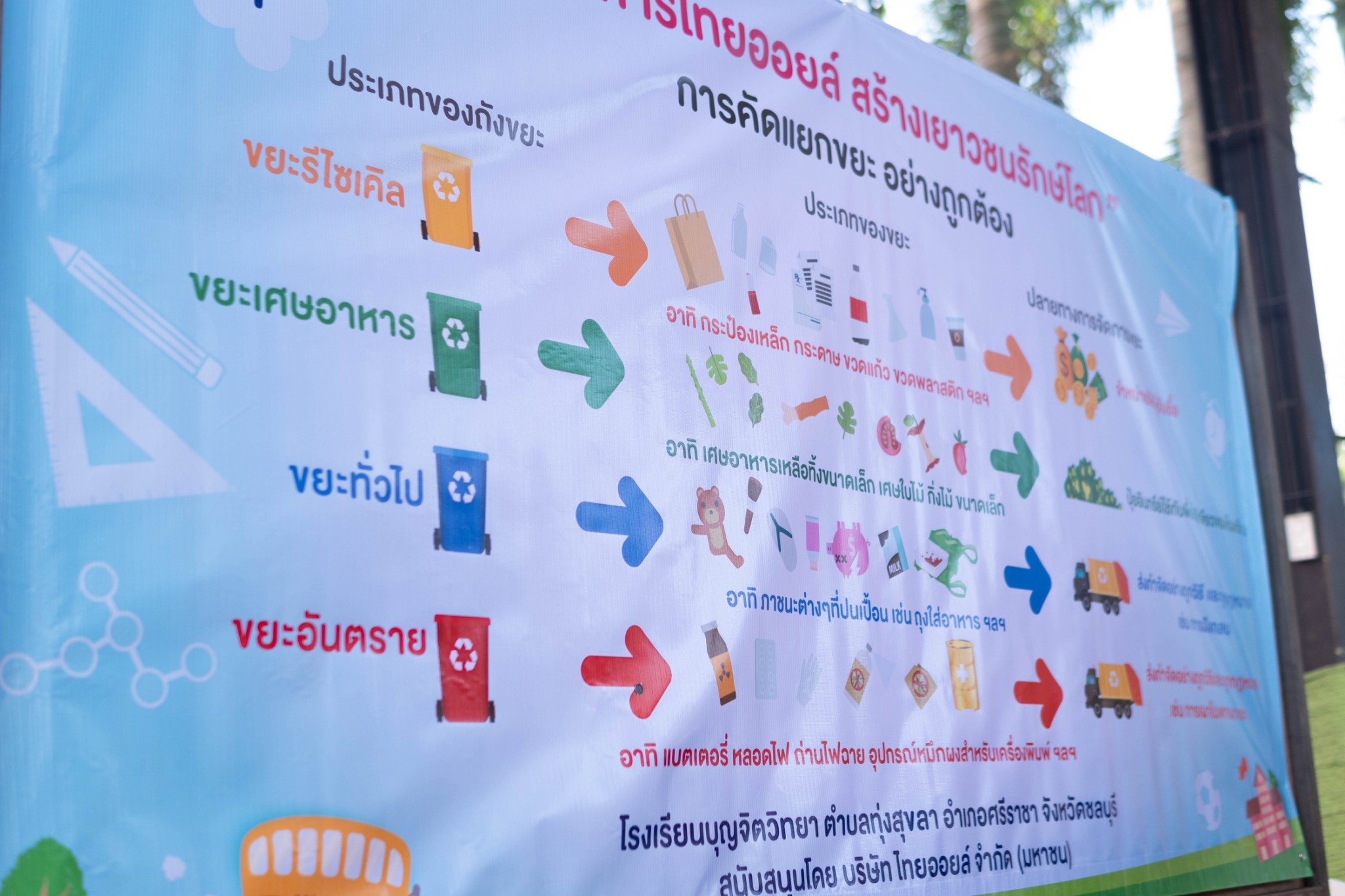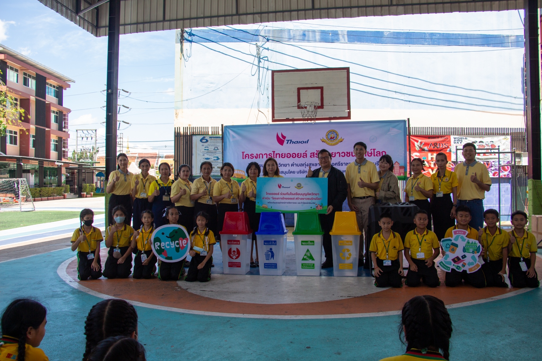 ให้ความรู้เกี่ยวกับการบริหารจัดการขยะอย่างยั่งยืนเป็นโรงเรียนต้นแบบด้านการจัดการขยะอย่างเป็นระบบรวมถึงการจัดการขยะ กระบวนการหมักปุ๋ย การรีไซเคิลน้ำมันที่ใช้แล้วและการเปลี่ยนขยะให้เป็นเงิน และมอบถังขยะ เครื่องหมักปุ๋ย ณ หน้าอาคาร 50 ปี ขอขอบคุณกลุ่มไทยออยล์ในการจัดโครงการ “ไทยออยล์ สร้างเยาวชนรักษ์โลก” ในครั้งนี้