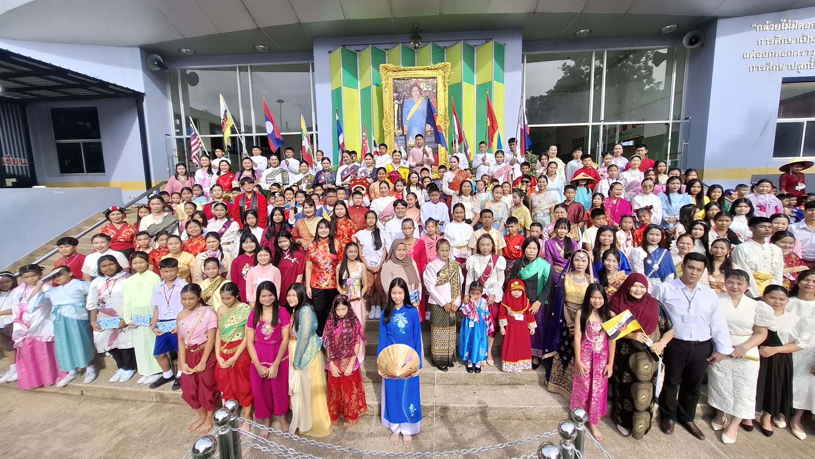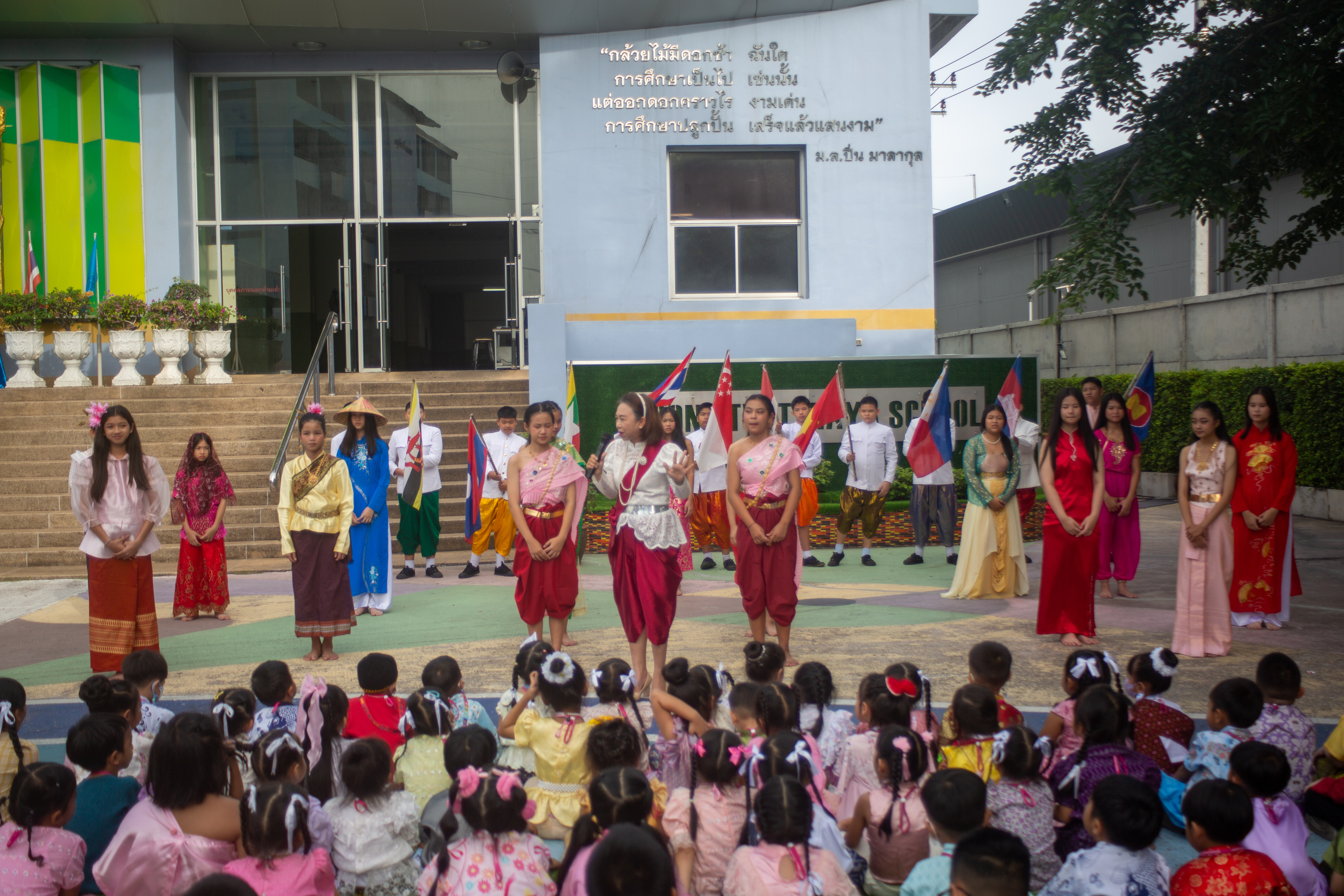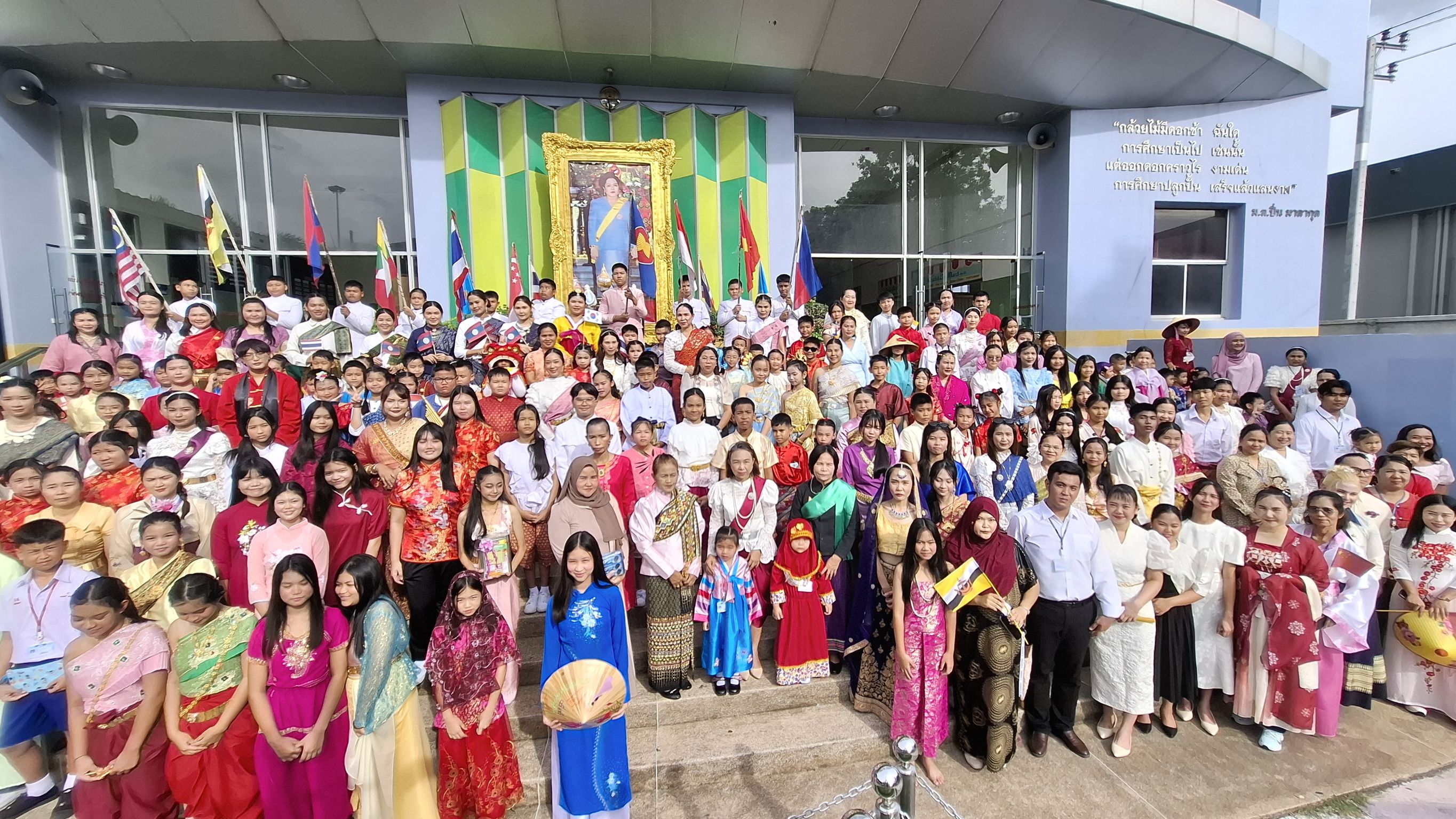 นักเรียนระดับชั้นอนุบาล 1 - ระดับชั้นมัธยมศึกษาปีที่ 3 เข้าร่วมกิจกรรมวันอาเซียนและการประกวดการแต่งกายชุดประจำชาติ ร่วมกิจกรรมตอบคำถามเกี่ยวกับวันอาเชียนและเดินประกวดชุดประจำชาติสวยงาม ในเเต่ละช่วงชั้น โดย นางชวาลา กันทอง ผู้อำนวยการโรงเรียนเป็นประธานในกิจกรรมและมอบรางวัลให้กับนักเรียนที่ชนะการประกวด ณ อาคาร 50 ปี
